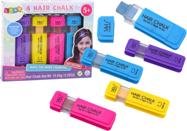 Открийте игривата промяна на прическата за миг! Този комплект съдържа 4 измиващи се тебешира за коса, които създават интензивни кичури, дъгови отблясъци и омбре ефект. Цветовете се нанасят лесно, подходящи са за всички типове и нюанси коса и след забавлението се отмиват с обикновен шампоан. Идеално творческо забавление за деца от 5 години с CE сертификация и в съответствие с EN71.