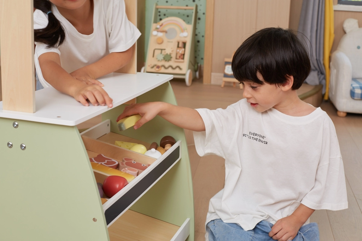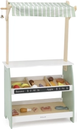Дървеното щандче предлага достатъчно място за различни видове играчки, поради което е чудесно за игри на магазин или зеленчуков пазар.