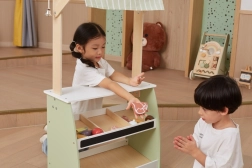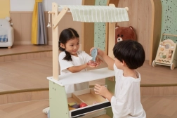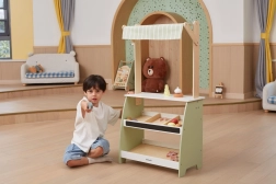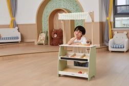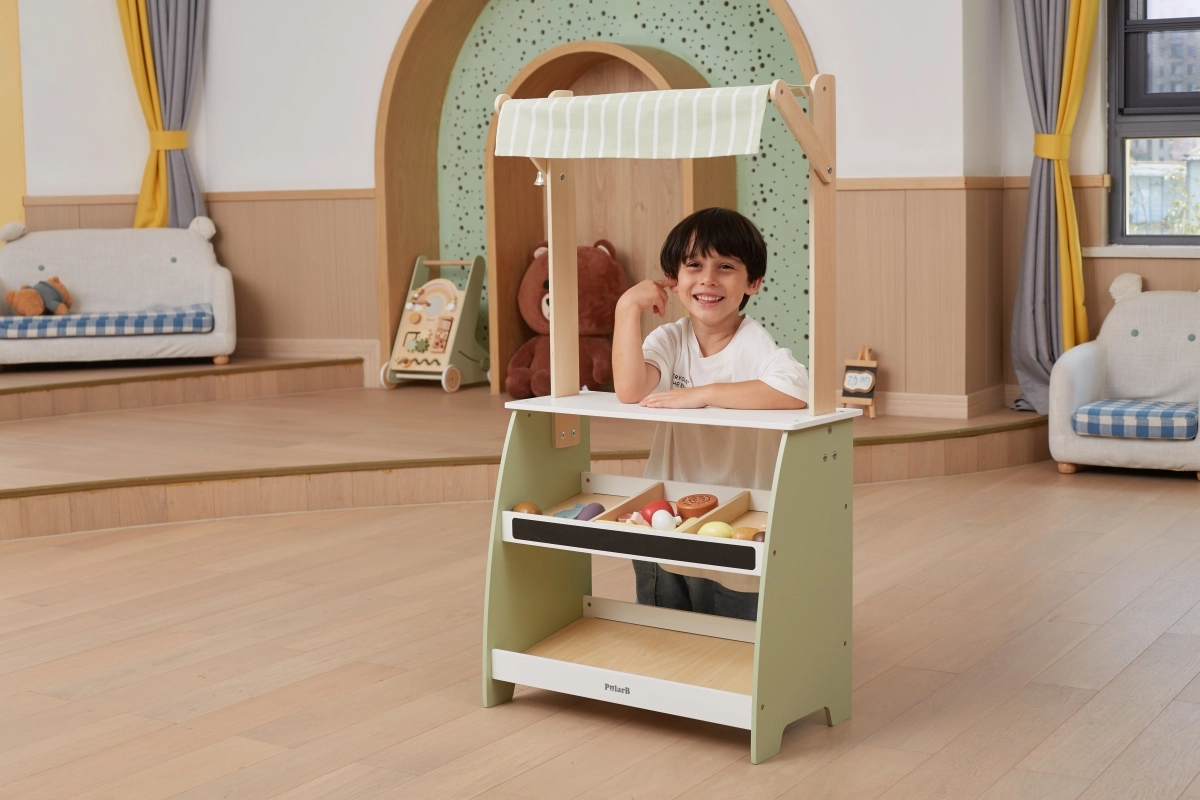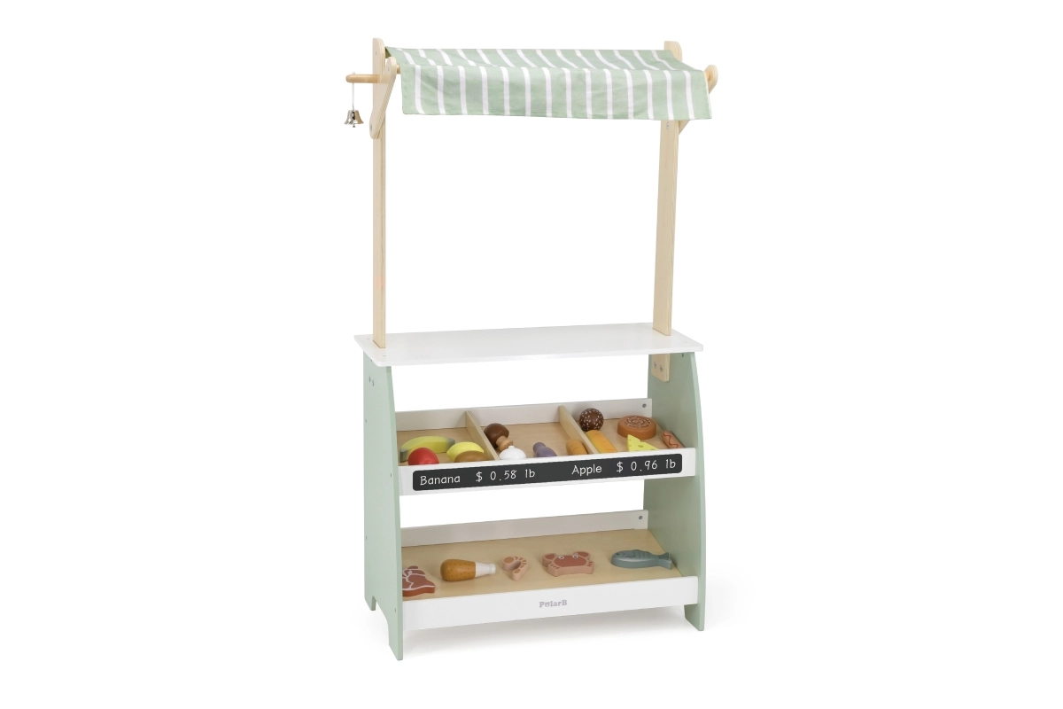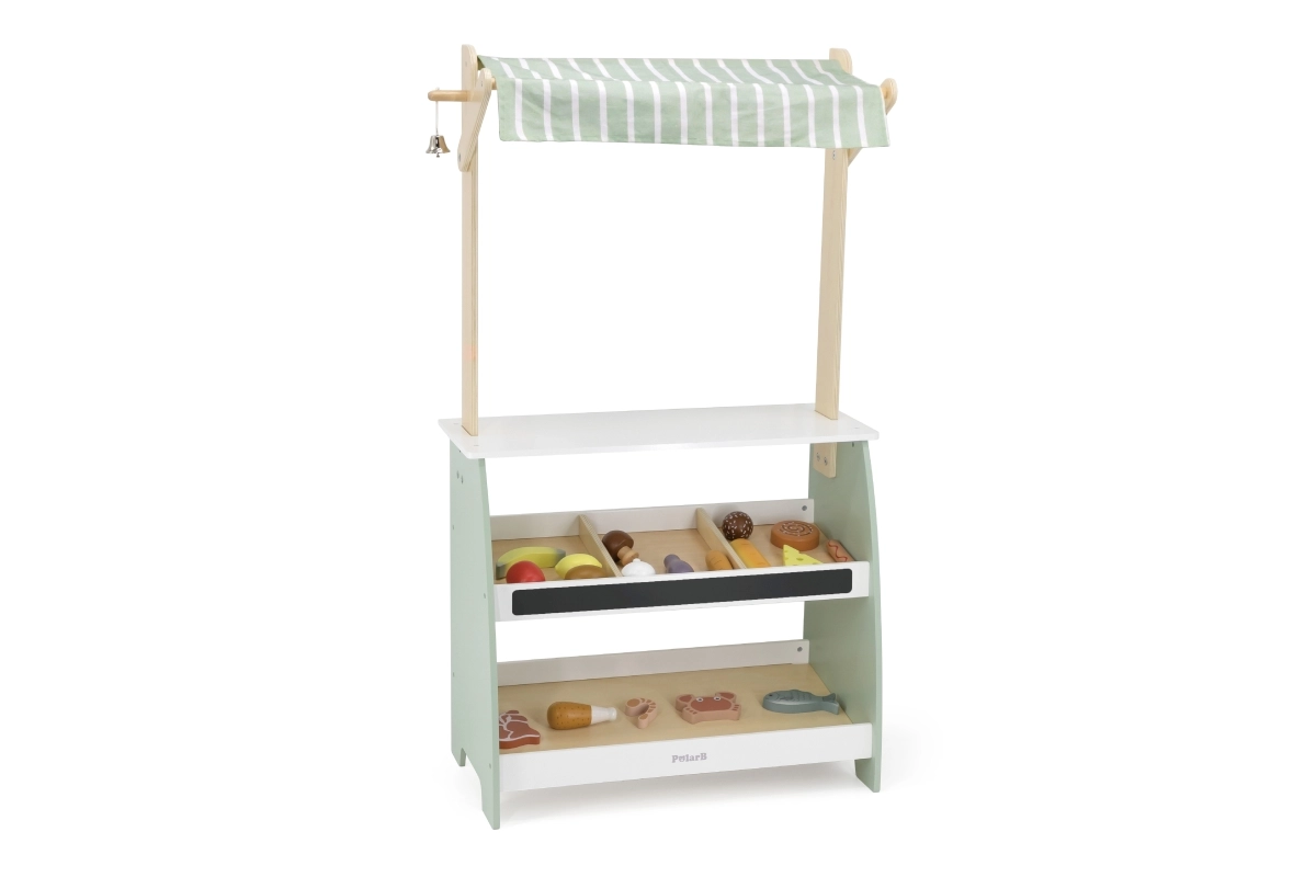 Щандчето е създадено с внимание към детайла, като рафтове и звънче, което стимулира детското въображение.