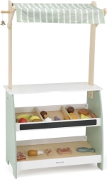 Дървеното щандче за игра от марката Viga ще донесе на вашите деца по-високо ниво на забавление при игра на магазин. Изработено от масивно дърво и боядисано в пастелни зелени нюанси, това щандче впечатлява не само с външен вид, но и с функционалност. Два рафта, текстилна сенник-маркиза и малко звънче го правят идеален кът за въображаема игра.