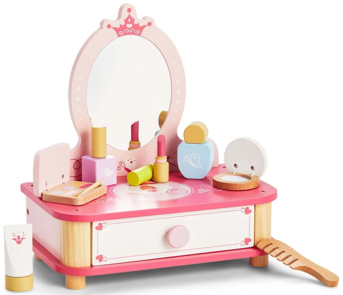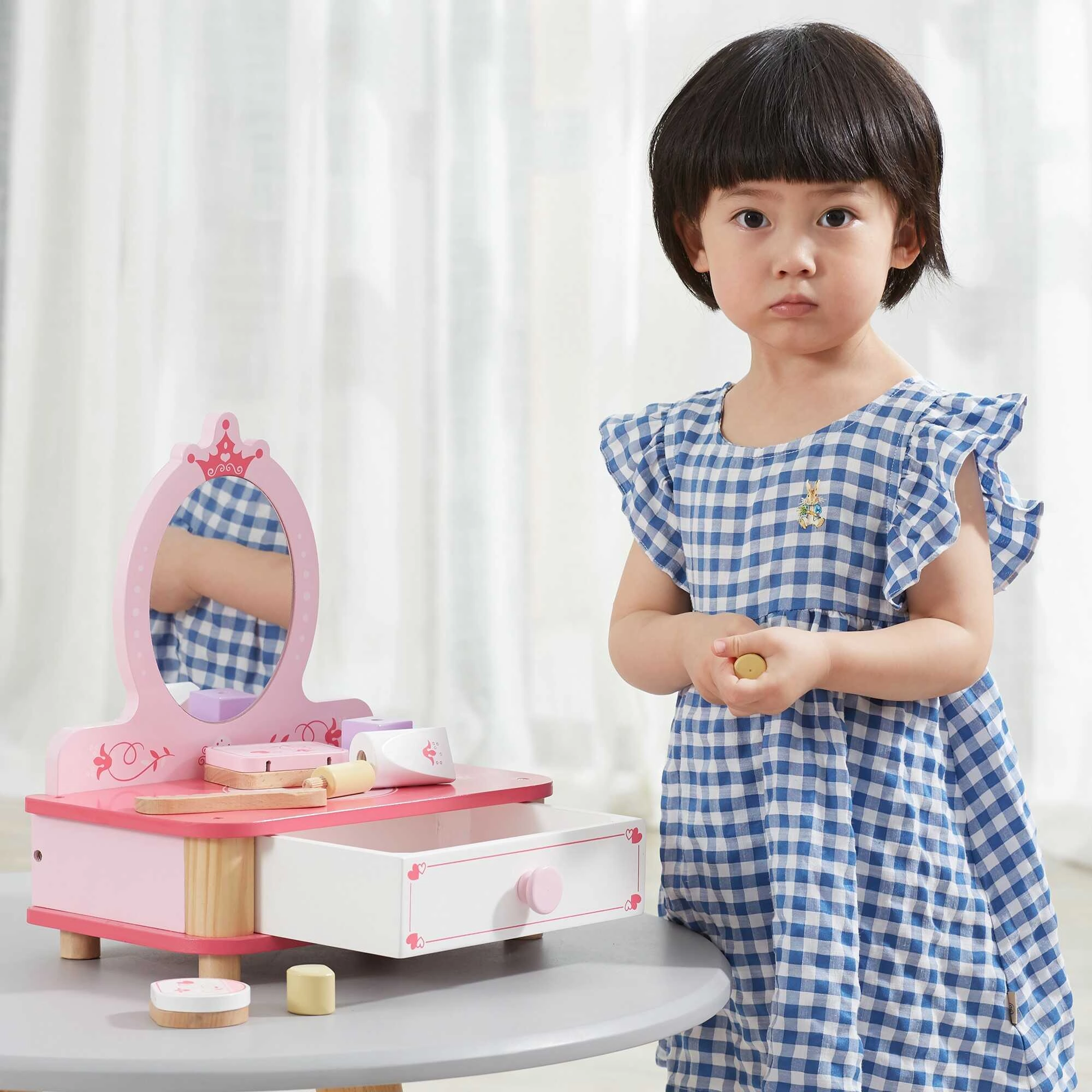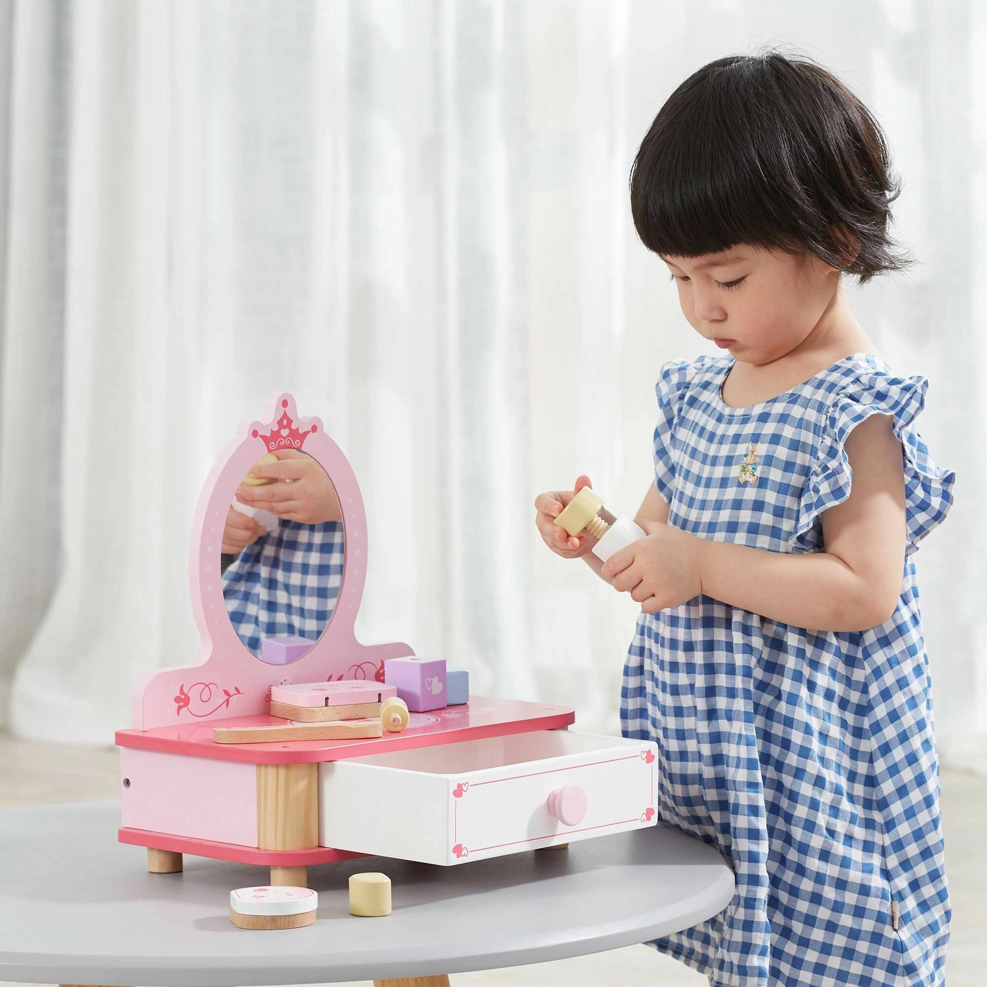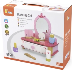 Комплектът включва дървени аксесоари като червила, парфюми и сенки за очи за създаване на безкрайни игрови сценарии.
