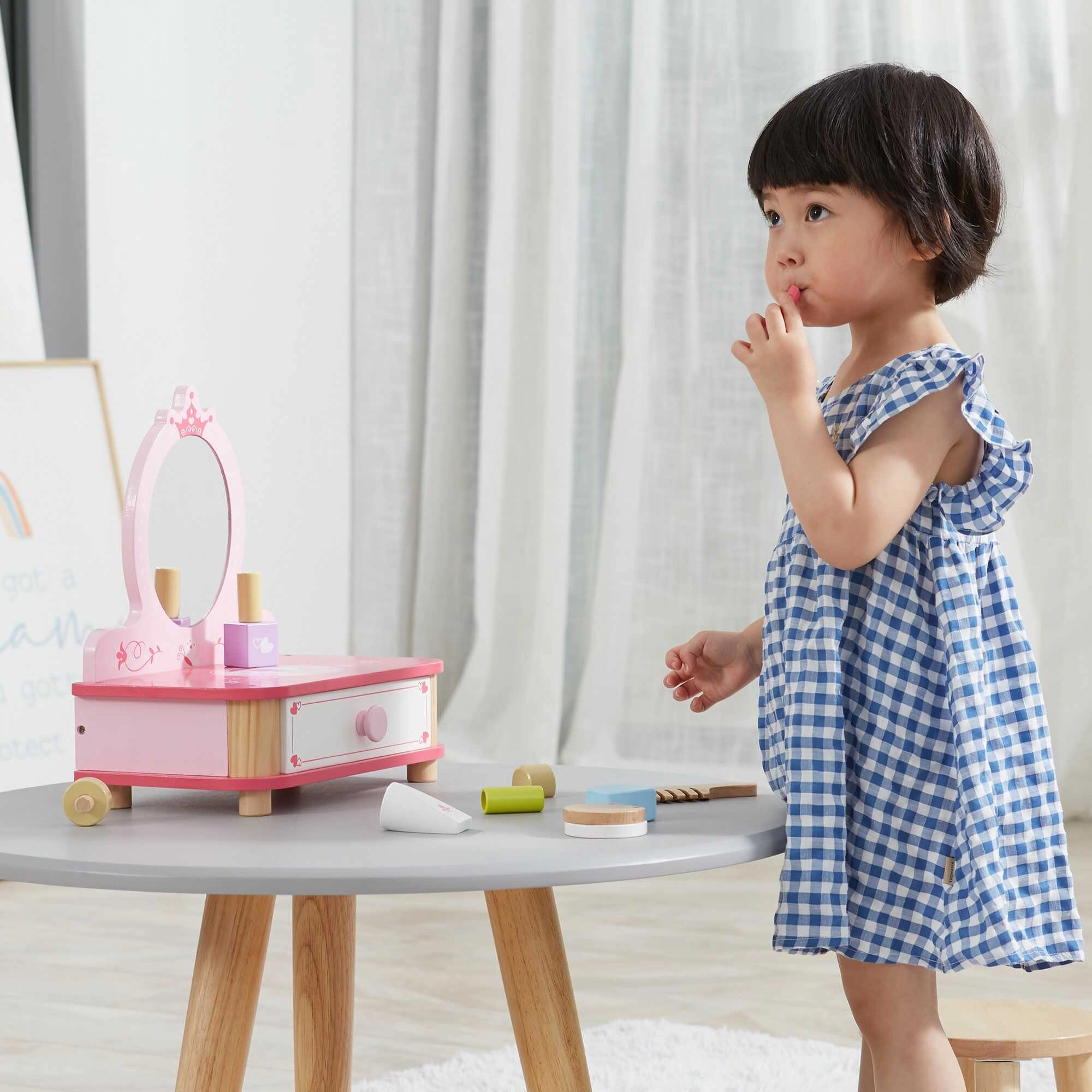 Красива розова тоалетка от марката Viga е идеалното допълнение към всяка детска стая. Комплектът включва огледало, изтеглящо се чекмедже и разнообразни дървени аксесоари за създаване на вълшебен свят, пълен с фантазия. Изработена от висококачествено дърво и боядисана с нетоксични бои, безопасни за деца.