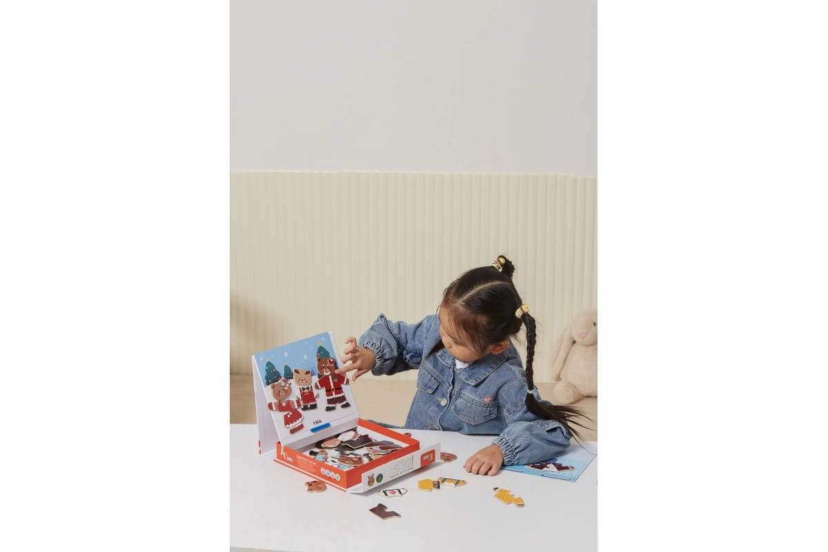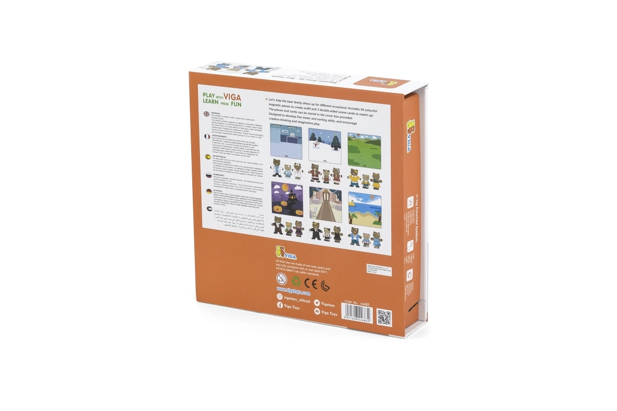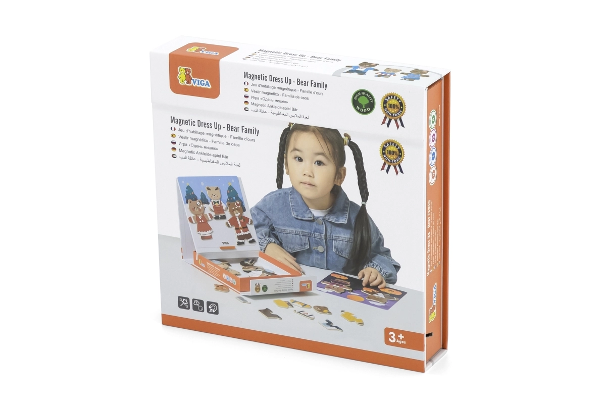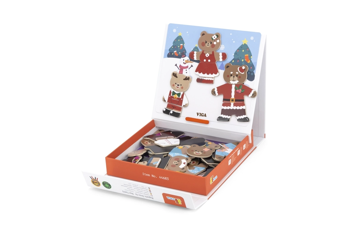 Открийте забавен комплект за малки творци: дървено магнитно обличане Viga – мечешко семейство с 54 части. Децата от 3 години при комбиниране на дрехи и изражения тренират фината моторика, координацията око–ръка и въображението. Компактната опаковка 21,5 × 21,5 × 4,5 cm се пренася и подрежда лесно.