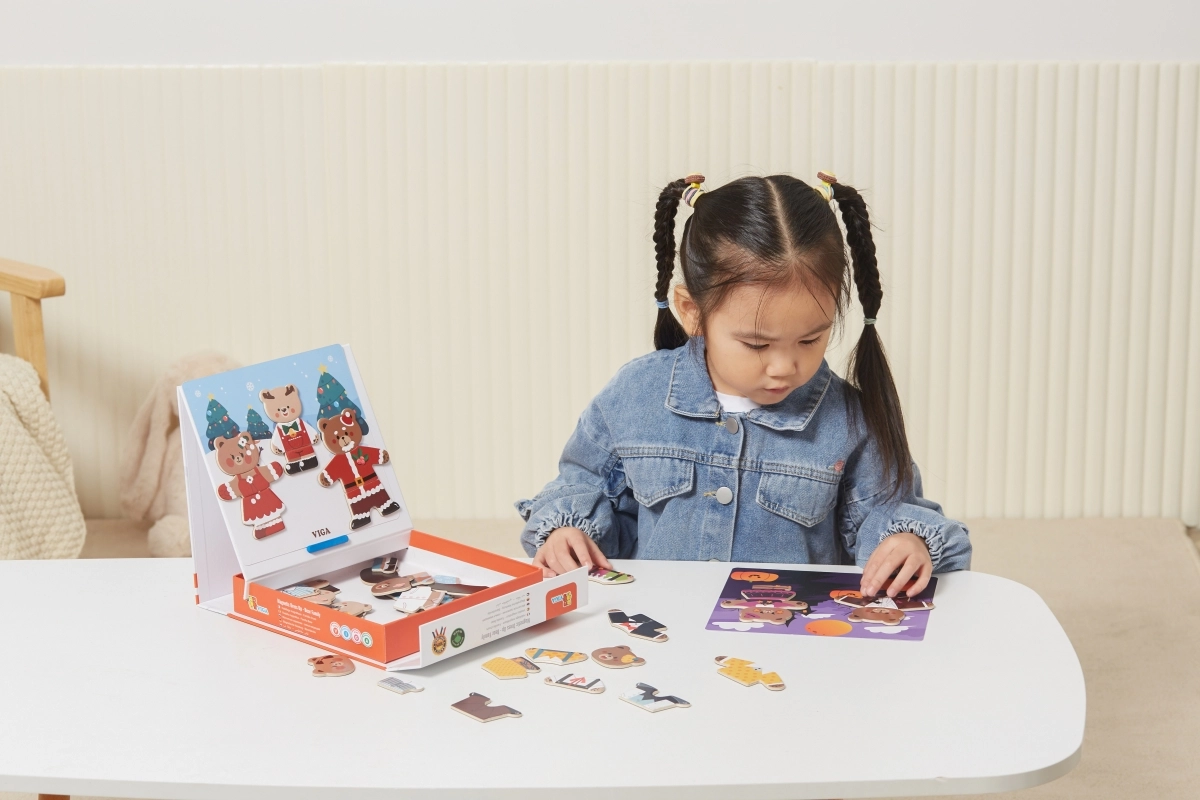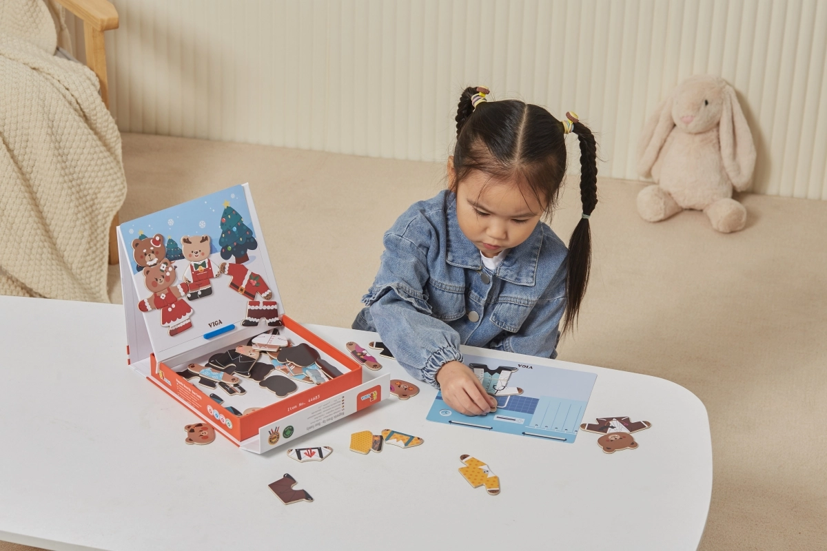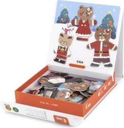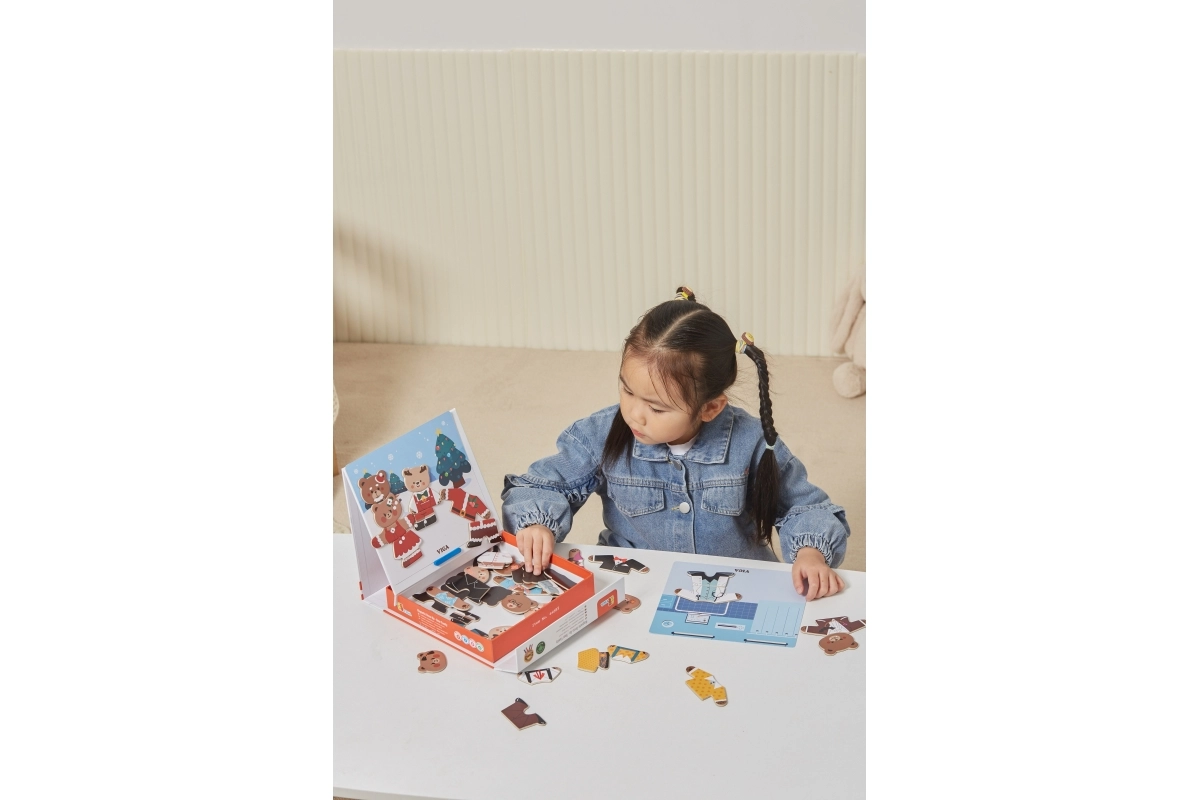 Открийте забавен комплект за малки творци: дървено магнитно обличане Viga – мечешко семейство с 54 части. Децата от 3 години при комбиниране на дрехи и изражения тренират фината моторика, координацията око–ръка и въображението. Компактната опаковка 21,5 × 21,5 × 4,5 cm се пренася и подрежда лесно.