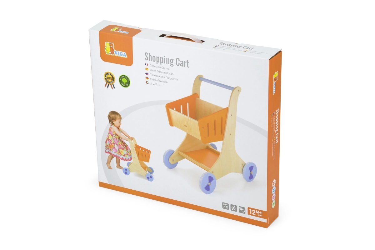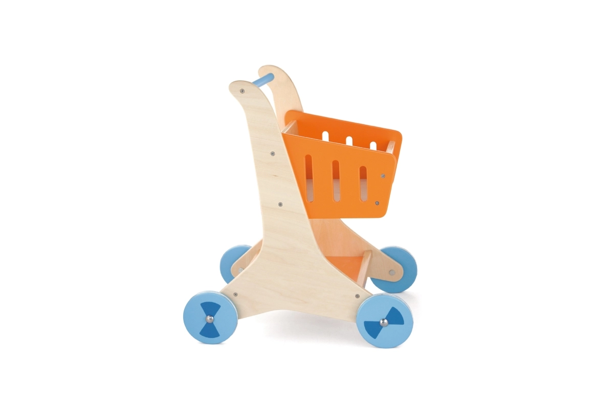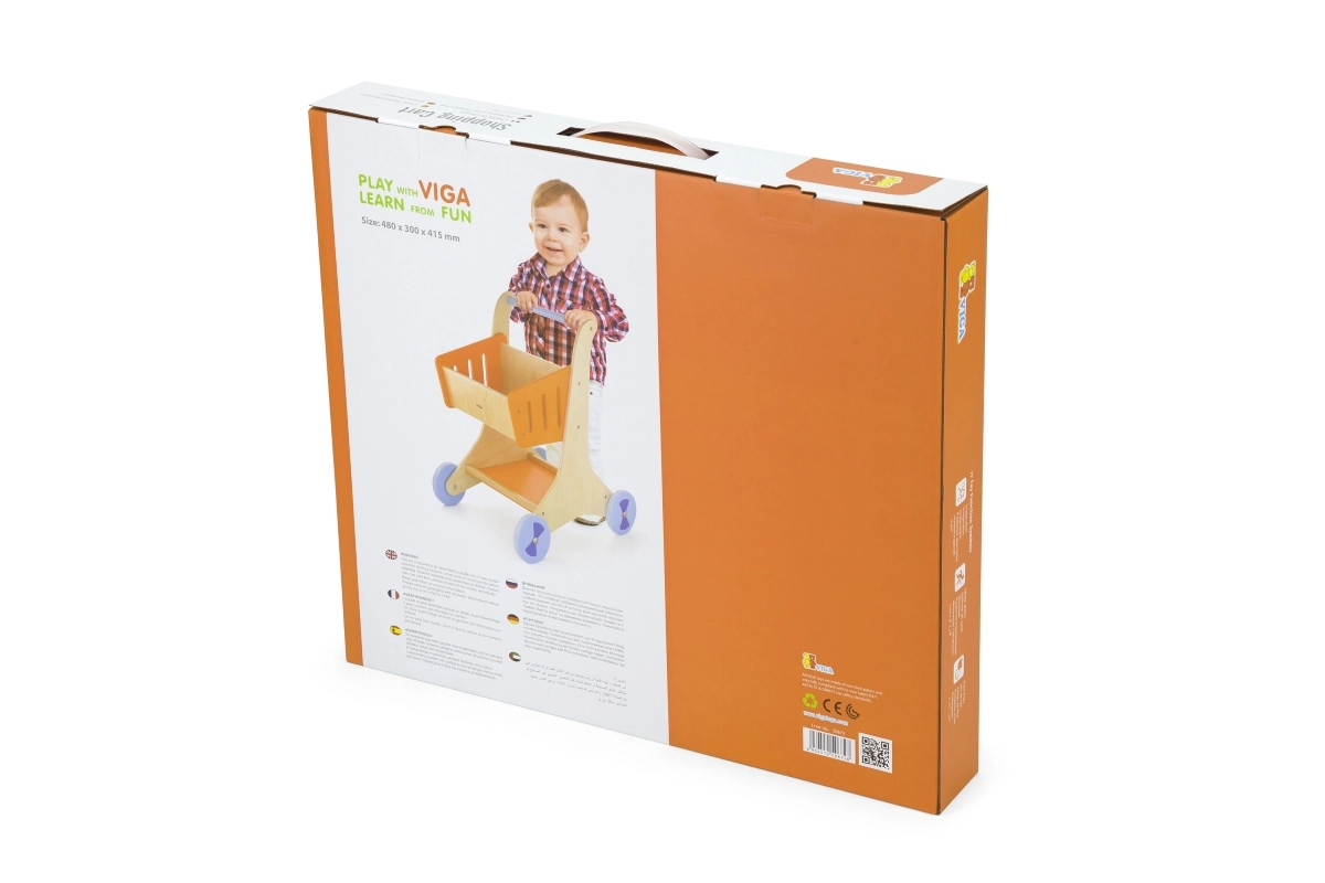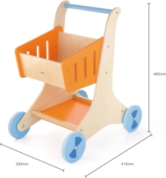 Обмислените размери приблизително 41,8 × 48 × 30 cm осигуряват удобно бутане и достатъчно пространство в кошницата. Качествената изработка с комбинация от естествено дърво и ярки цветове стимулира сетивното възприятие и превръща количката в атрактивен акцент в детската стая.