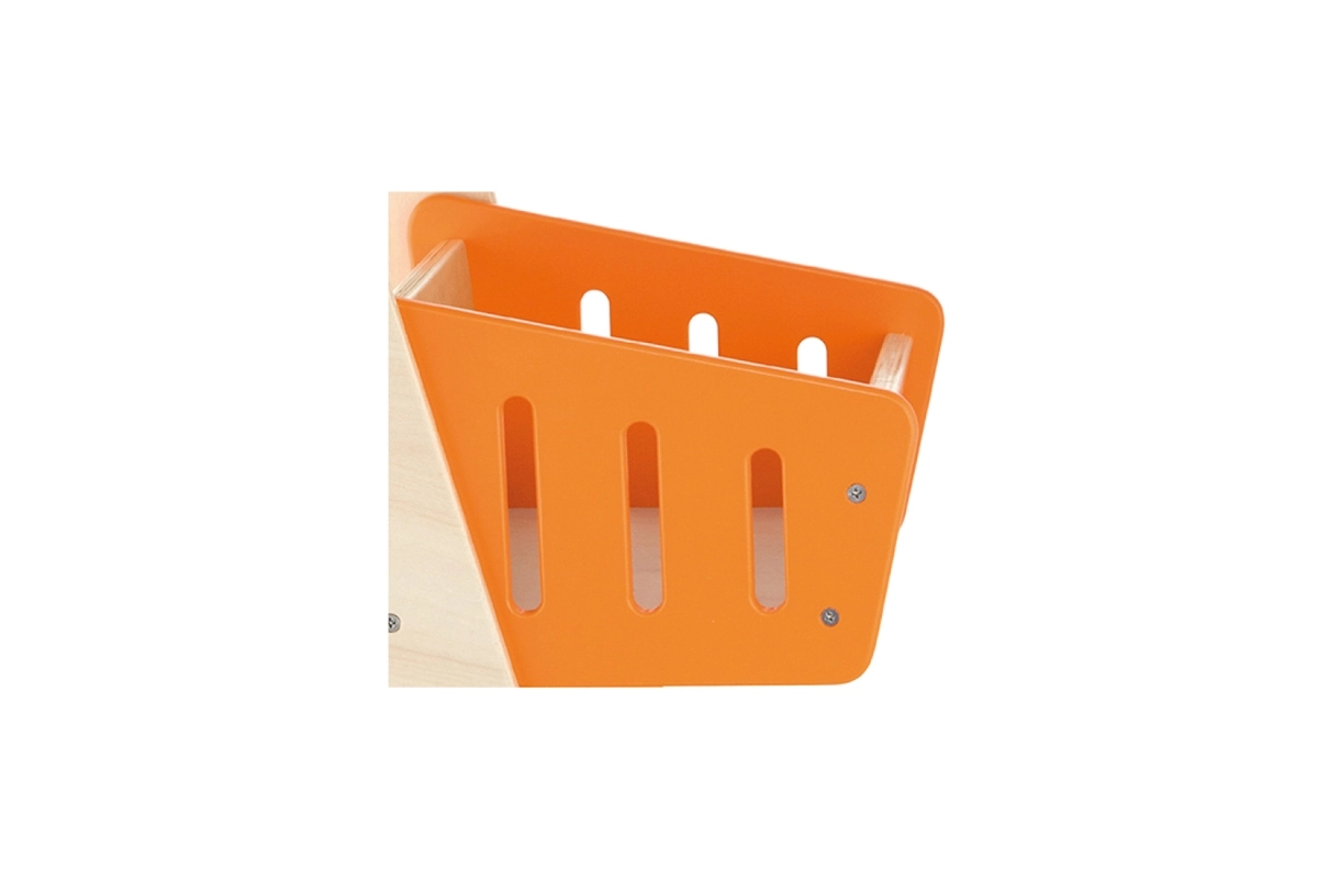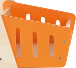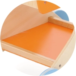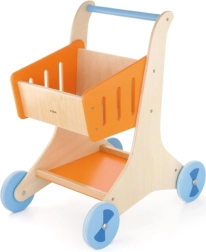 Стилна дървена пазарска количка с оранжева кошница и сини колелца, идеална за първите стъпки в света на ролевите игри. Подпомага развитието на грубата моторика, равновесието и креативното въображение. Лека, стабилна конструкция с гладки ръбове, безопасна за деца от 12 месеца.
