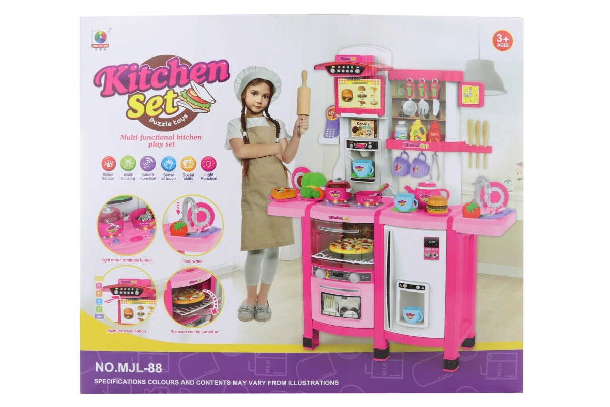 Тази пластмасова кухня е оборудвана с котлон, миялна машина, мивка, фурна и хладилник, което я прави идеална играчка за креативни деца. В кухнята вашите малки готвачи ще открият и пластмасови съдове, хранителни продукти и ястия, които ще стимулират тяхното въображение.