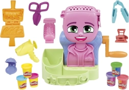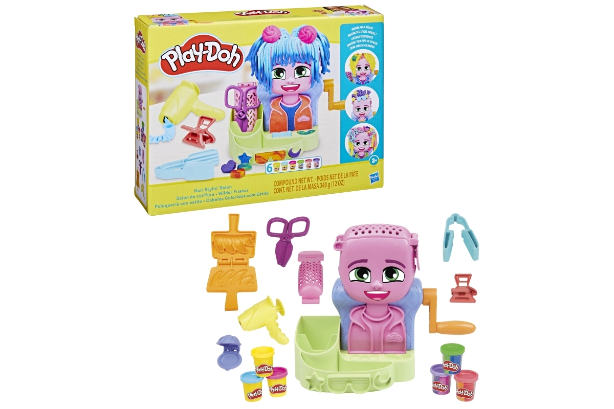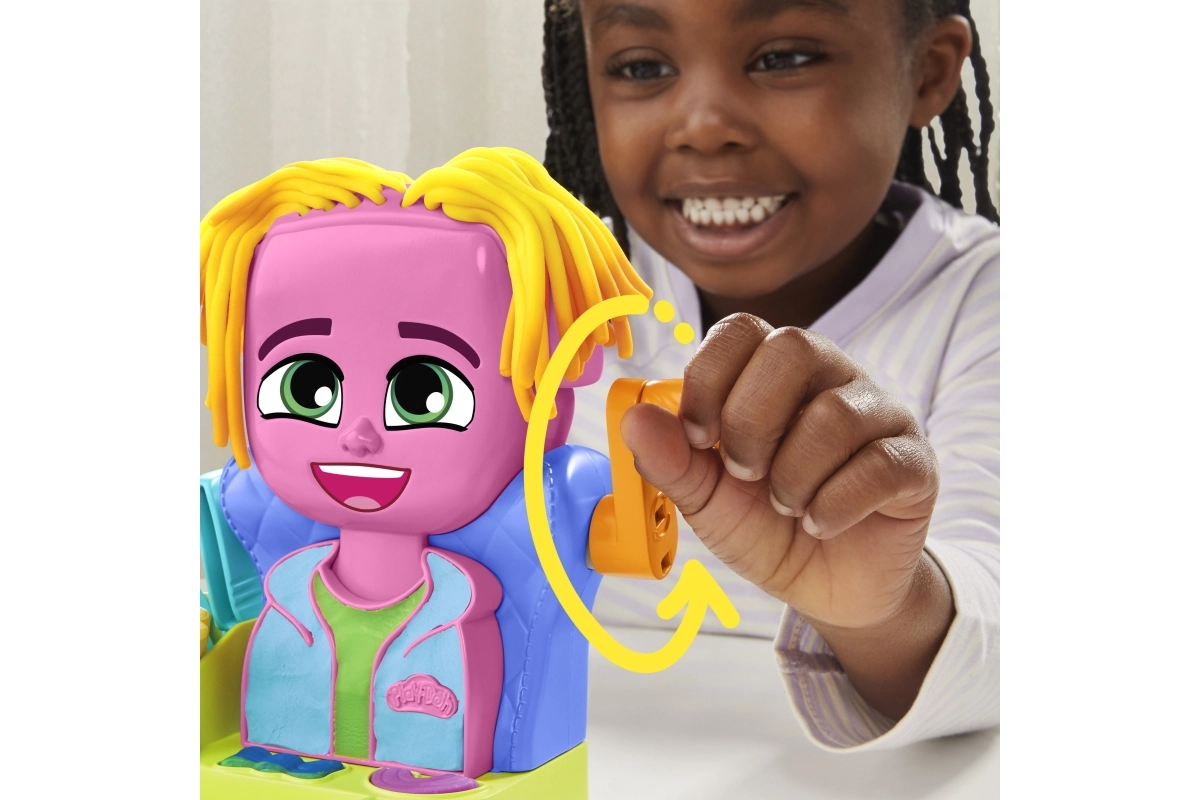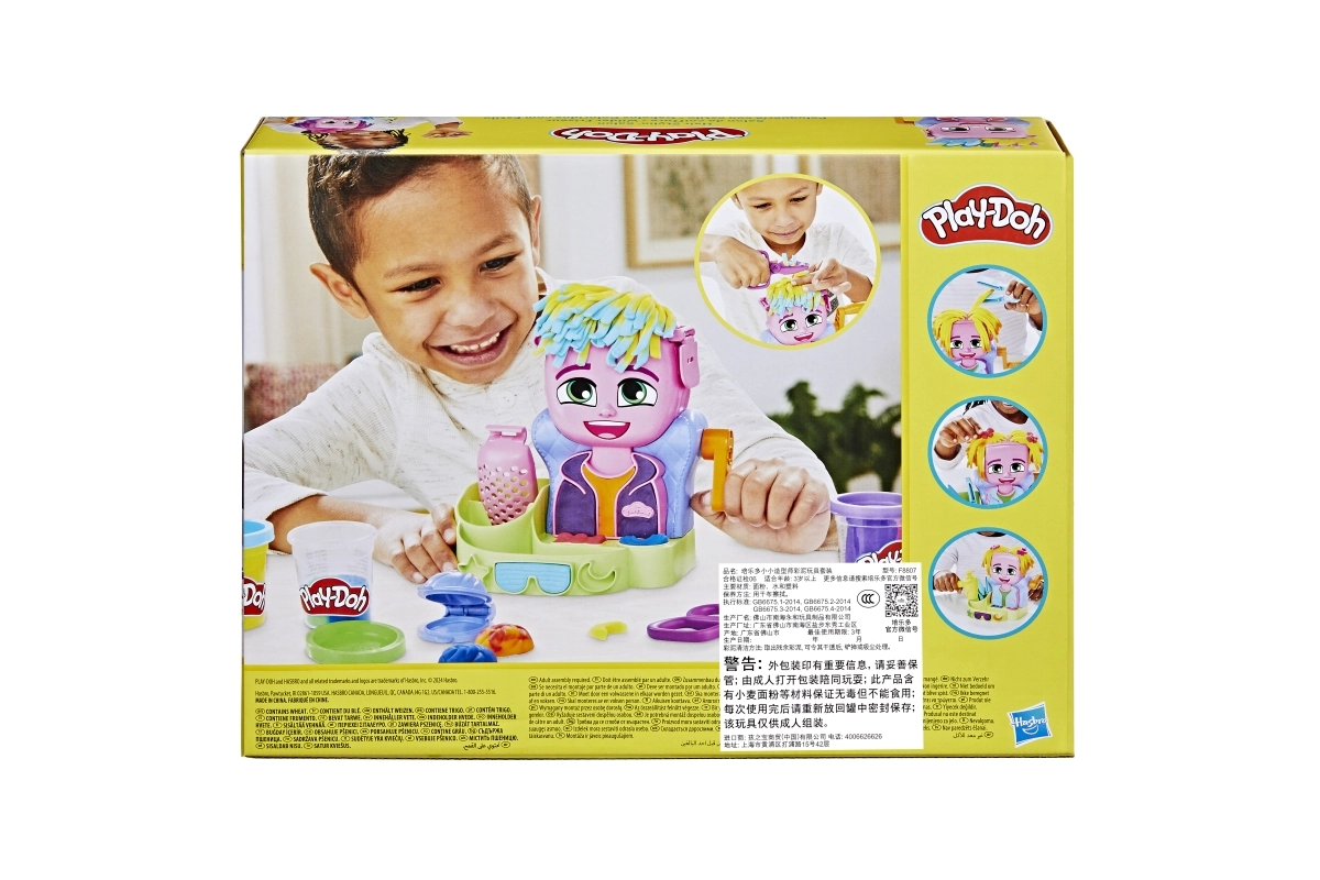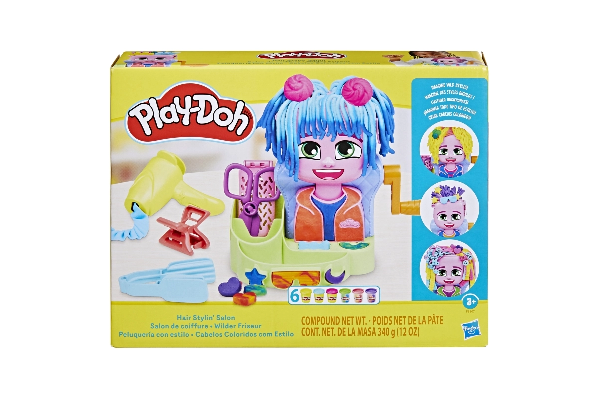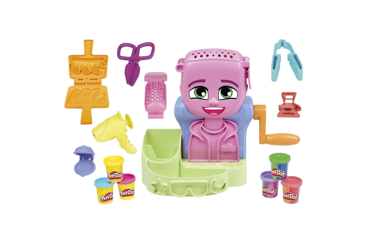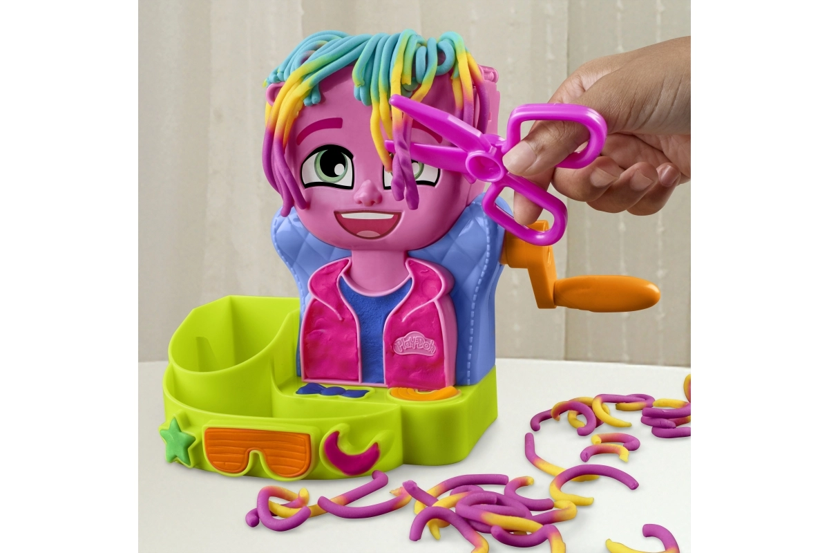 Открийте най-големия фризьорски комплект от PLAY-DOH: гигантска глава за изтласкване на „коса“, двуцветно тесто и множество аксесоари за стилизиране. Благодарение на лесното изтласкване, играчешкия сешоар, формите за къдрици, вълничките и фибите, децата винаги създават нова визия. Насладете се на безкрайни възможности за креативност, лесна употреба и пъстроцветни прически от моделина.