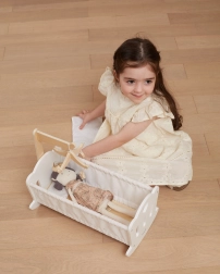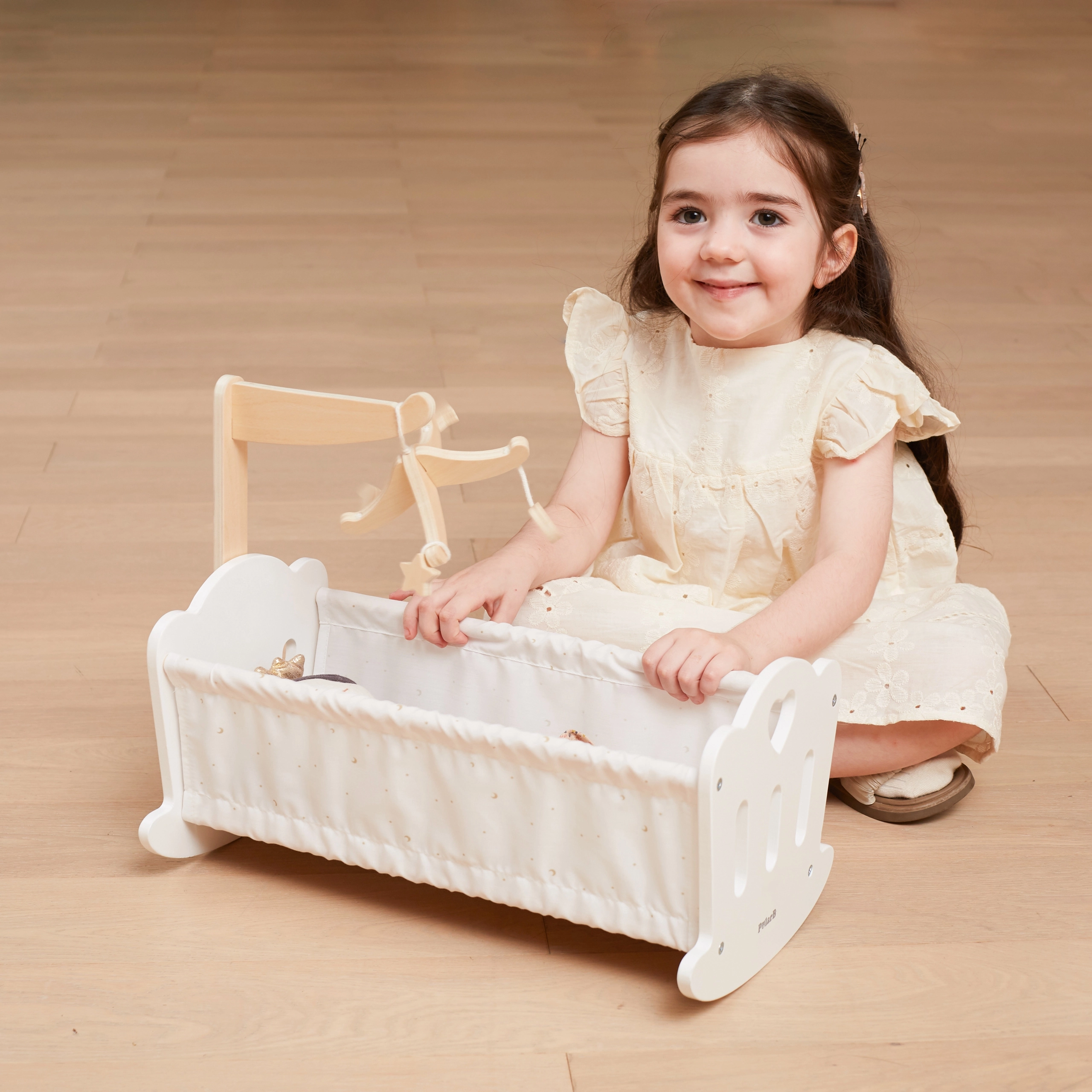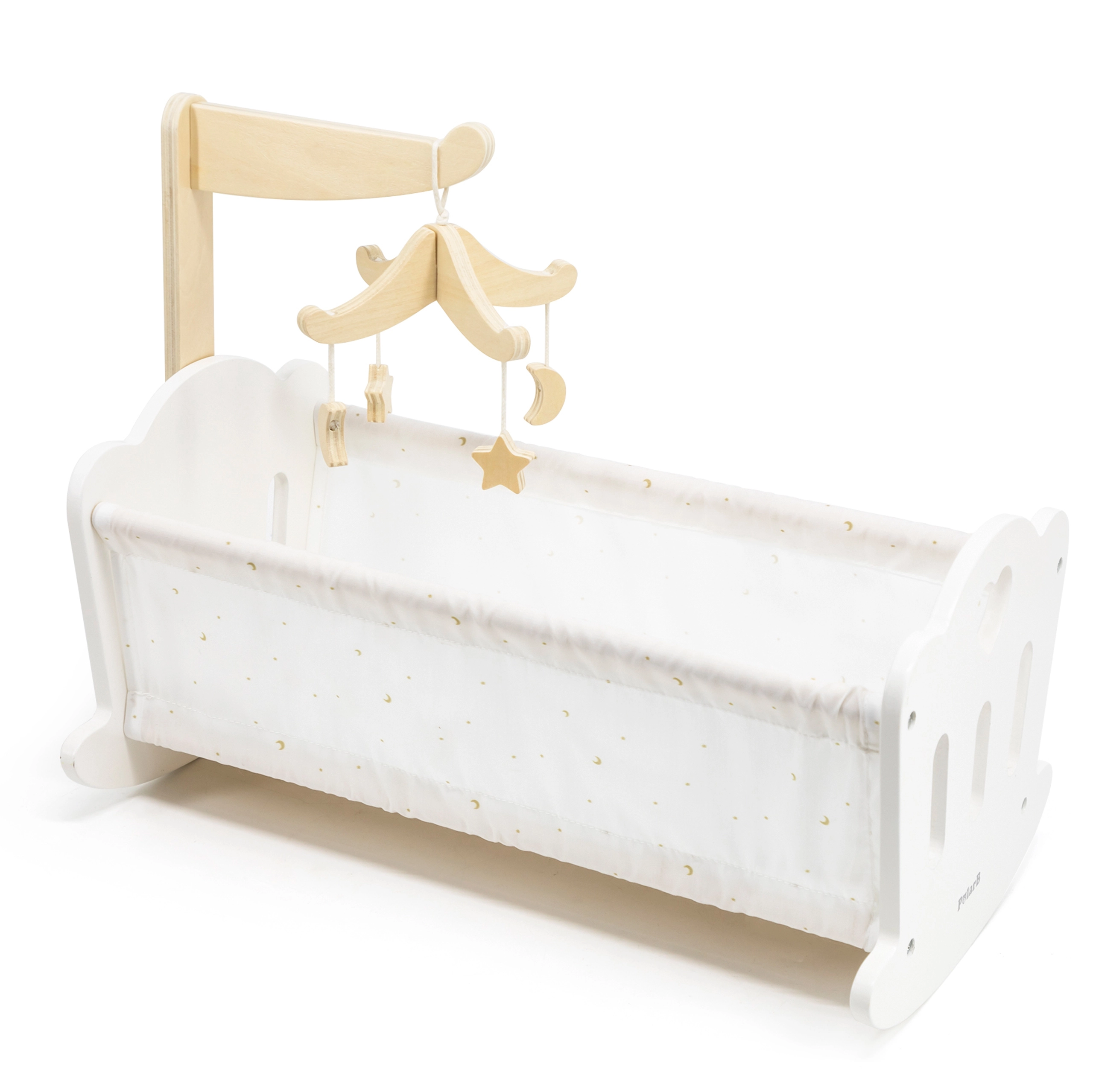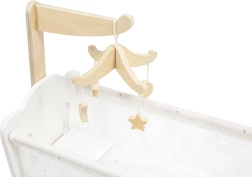 Дървената люлка-кошара за кукли PolarB съчетава непреходен дизайн, качествена изработка и нежни текстили с принт на звездички и лунки. Интегрираният дървен мобил с висящи фигурки добавя магия към играта и помага на децата да развиват отношение към грижата и успокояващите ритуали.