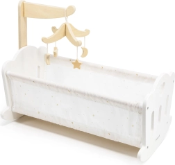 Висящият дървен мобил предлага визуални стимули и придава на люлката вълшебна атмосфера за успокояващи ритуали преди сън на куклата.