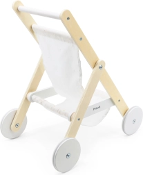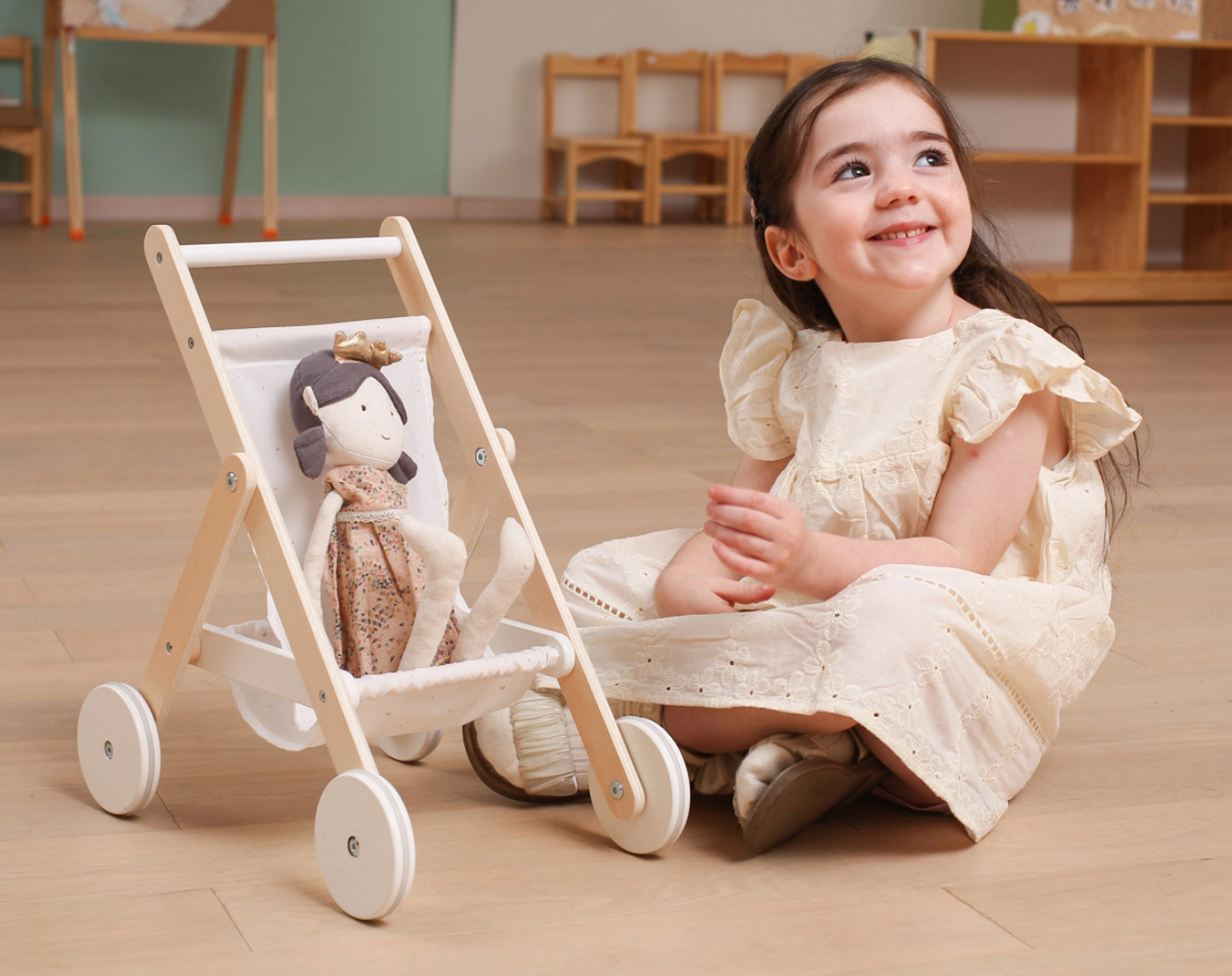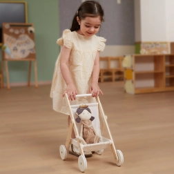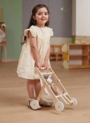 Подарете на децата реалистична игра „на родители“ с елегантната дървена количка за кукли. Тя съчетава неподвластен на времето дизайн, качествени материали и безопасна изработка, за да бъде всяка „разходка“ с куклата удобна и тиха. Гумените протектори на колелата намаляват шума по пода и подобряват стабилността при първите стъпки.