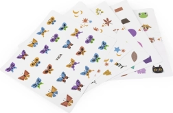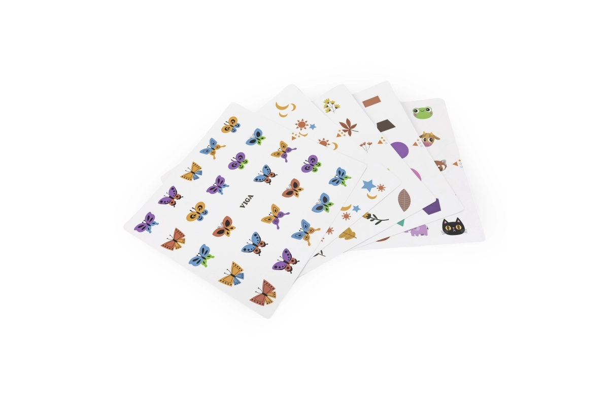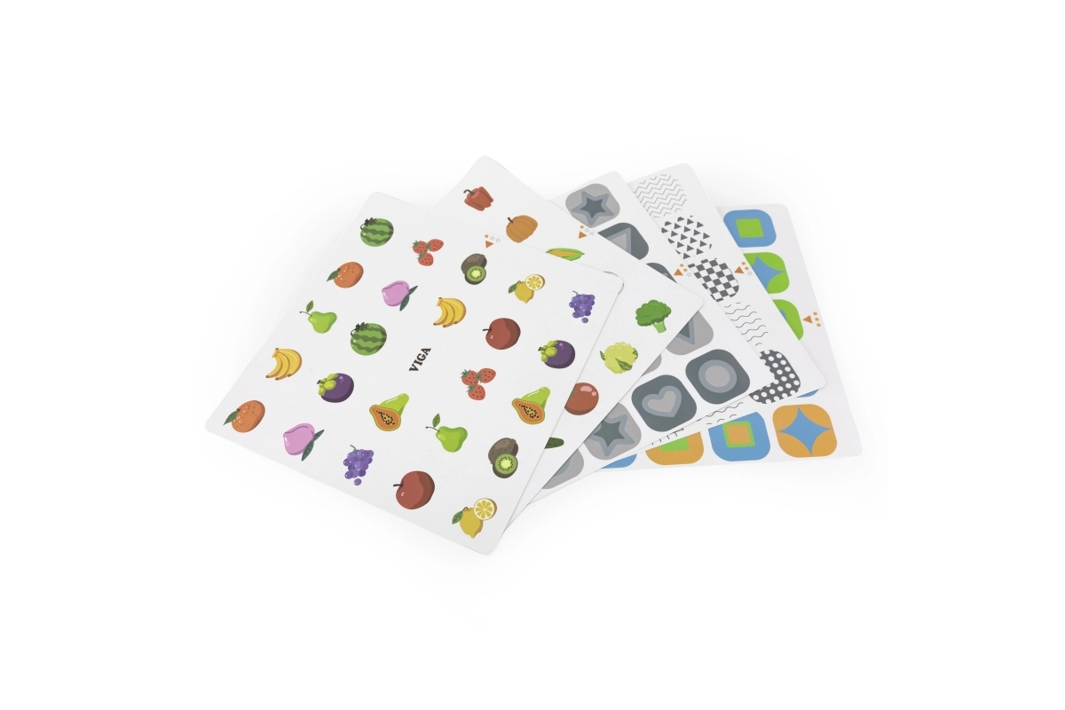 Цветни карти с мотиви на форми, плодове и животни позволяват да се настройва трудността и да се учат децата на разпознаване и сортиране.