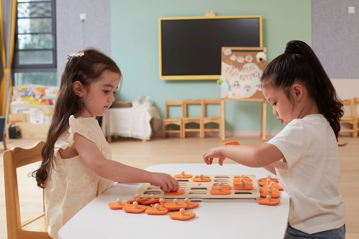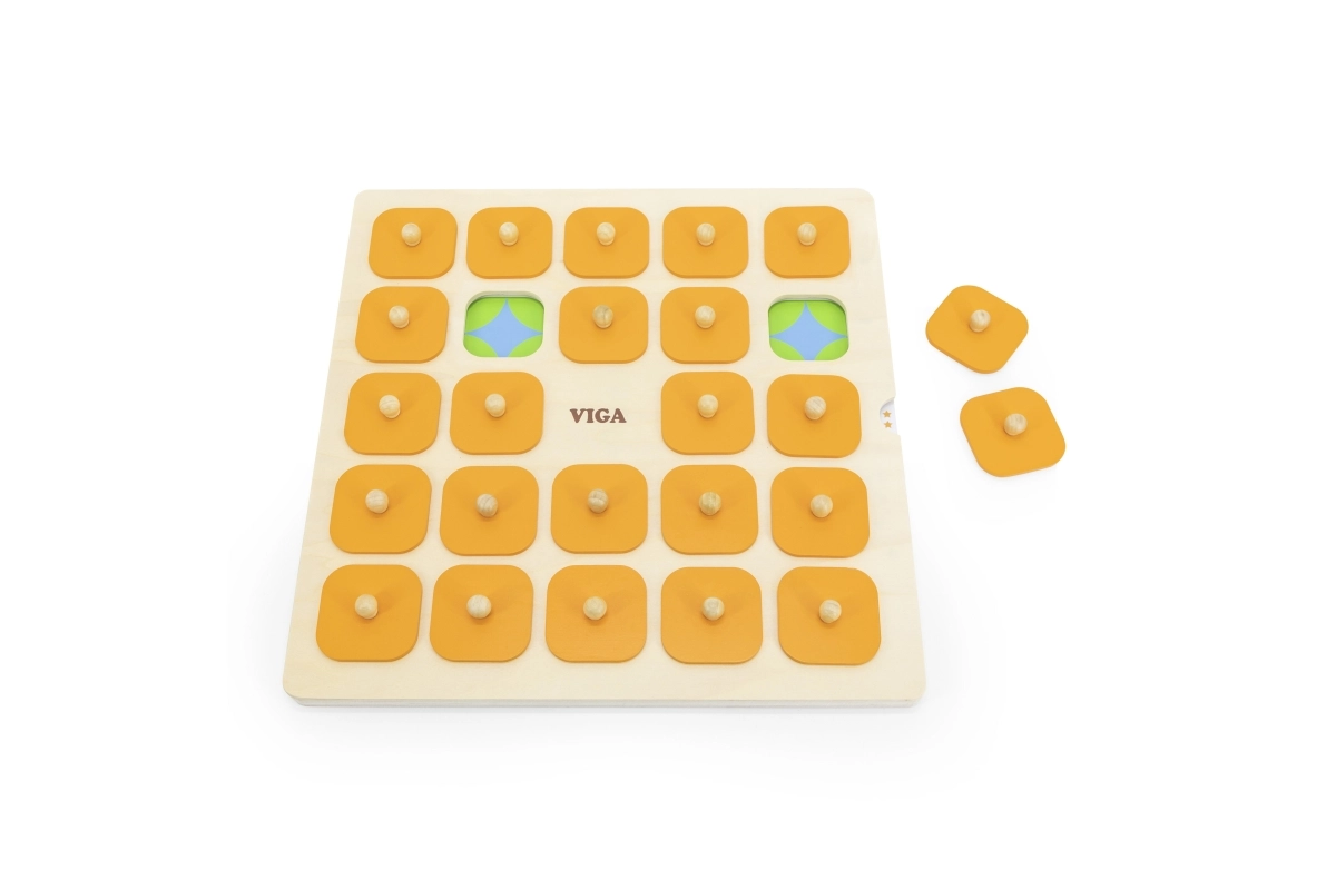 Масивна дървена дъска с 25 квадратни прозорчета и оранжеви капачета с дръжки е издръжлива и удобна за малки детски ръце.