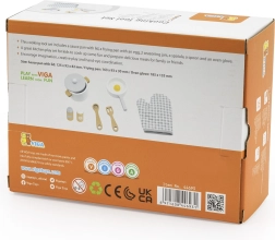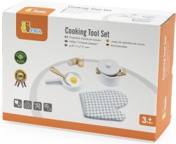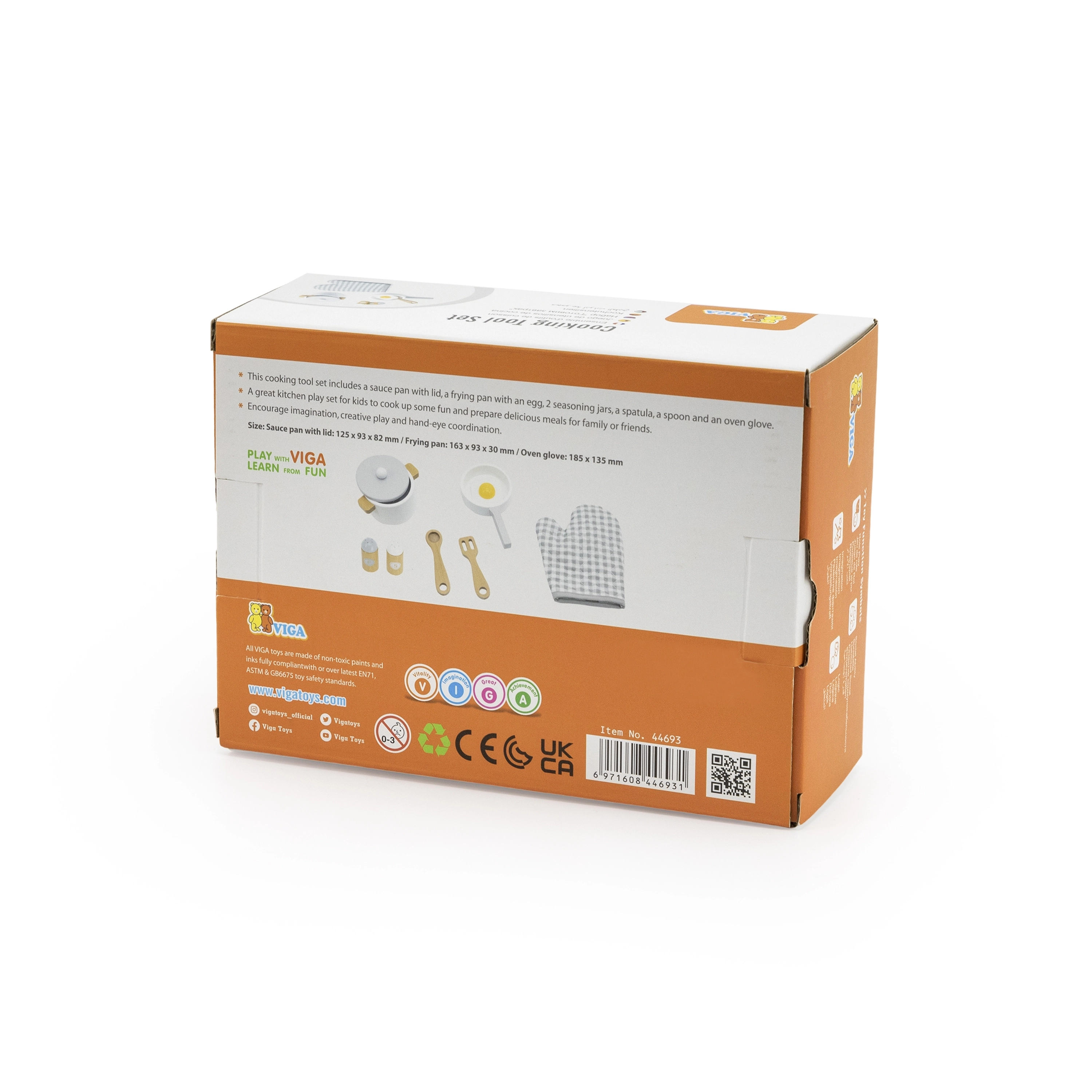 Стилен дървен кухненски комплект от VIGA, идеален за игра на готвене и развитие на въображението, креативността и фината моторика. Съдържа тенджера с капак, тиган с яйце на очи, солница и пиперница, шпатула, лъжица и кухненска ръкавица. Изработен от висококачествено дърво и боядисан с нетоксични бои – безопасно забавление за деца от 3 години.
