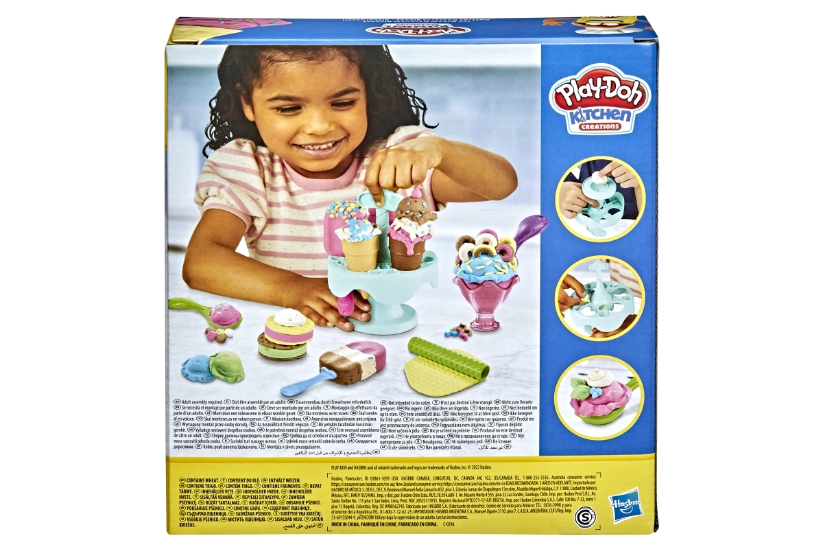 С този сладоледен комплект Play-Doh децата могат да приготвят „порции“ сладолед във фунийка или чашка, да ги украсяват и да ги сервират на стойката. Лесен за използване, не лепне и носи часове креативно забавление.