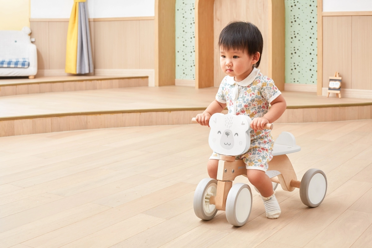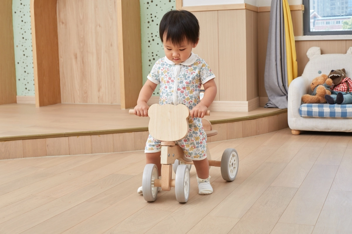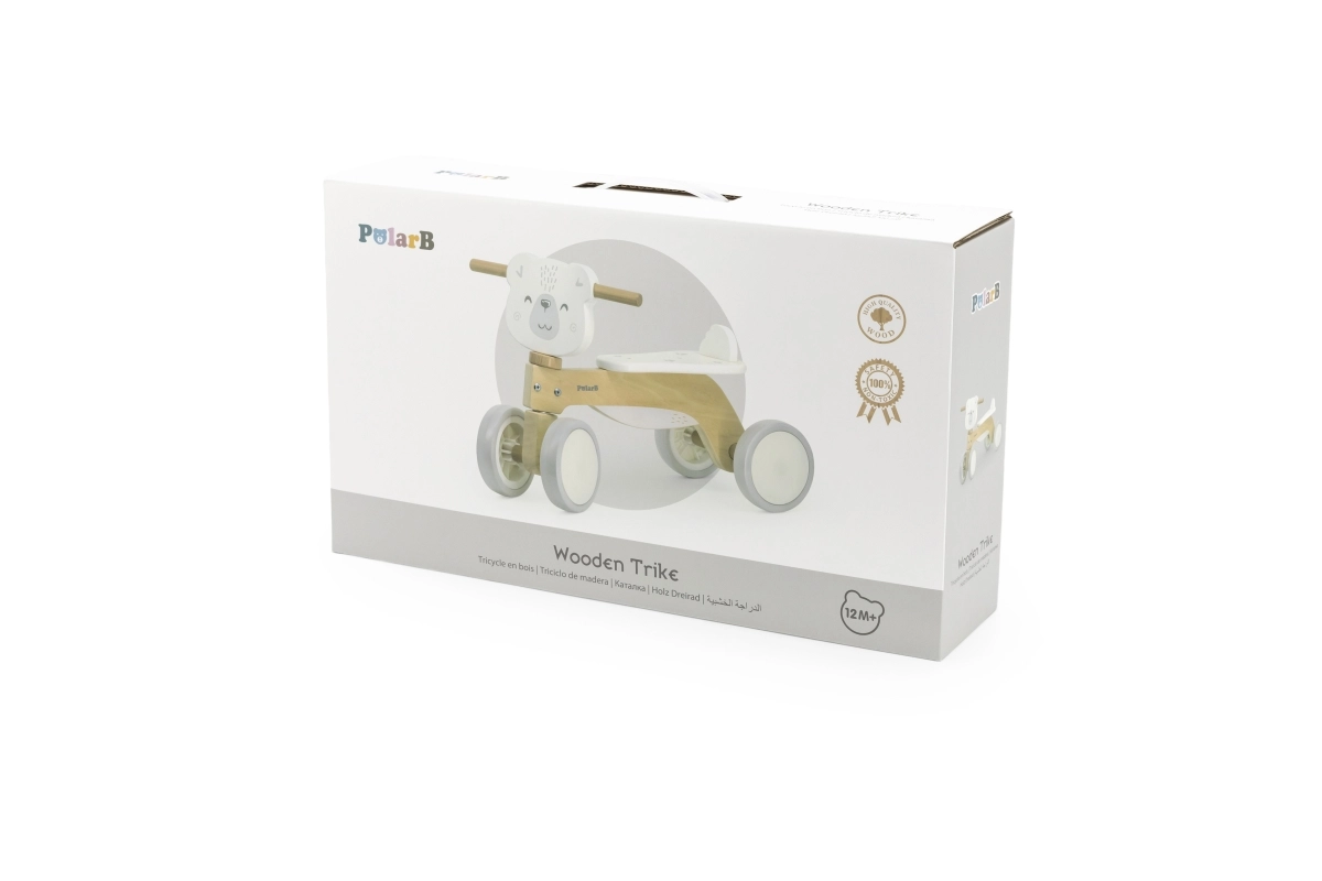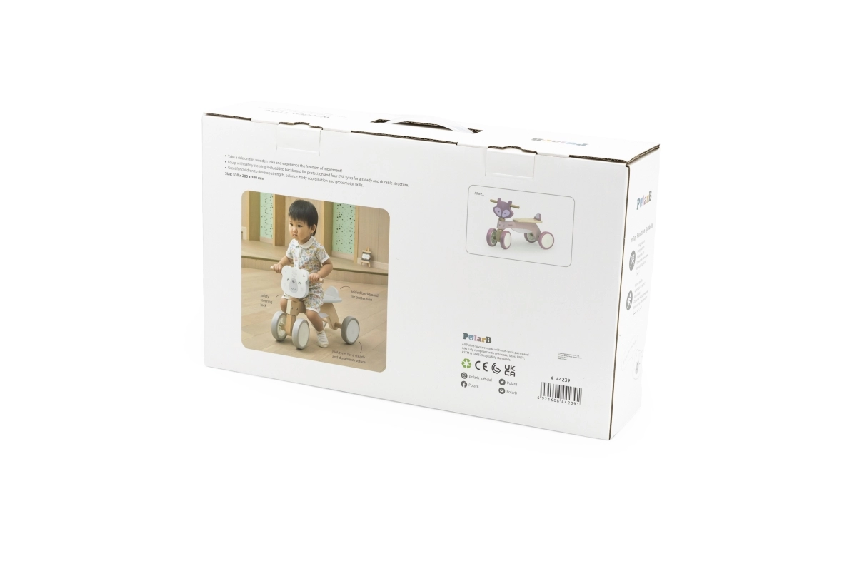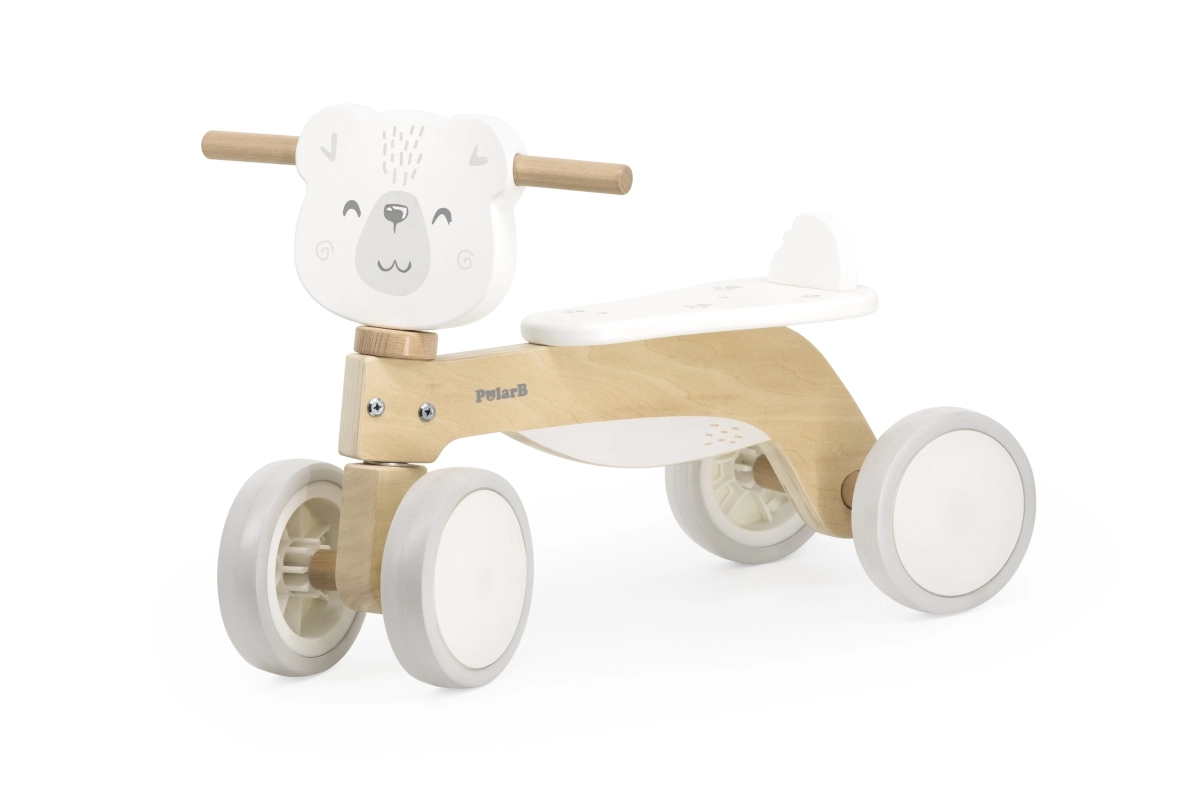 Детското дървено баланс колело PolarB е безопасен и изчистен помощник за първите карания у дома и върху гладки външни настилки. Благодарение на четирите стабилни колела малките колоездачи бързо придобиват увереност, докато тихите EVA колела щадят пода и не нарушават домашната среда. Блокирането на кормилото ограничава екстремното завъртане и помага за предотвратяване на падания.