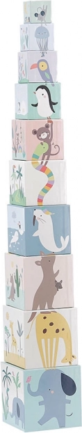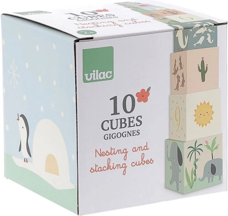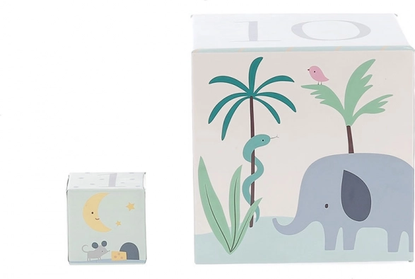 Този първи комплект кубчета се адаптира към темпото на растеж на вашето дете: от проста манипулативна игра, през строене на кула, до усвояване на числата 1–10. Всяко кубче е украсено с нежни илюстрации на животни от целия свят и ясни цифри, които естествено насърчават разпознаването и назоваванията.