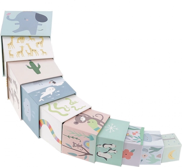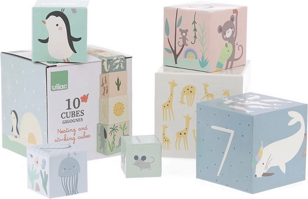 Кубчетата са изработени от висококачествен, лек и издръжлив картон. Благодарение на постепенно намаляващия размер лесно се подреждат едно върху друго и се вгнездяват, спестявайки място и правейки комплекта идеален и за път. Дизайнът на Сара Бец подчертава игривостта и подкрепя въображението и концентрацията.
