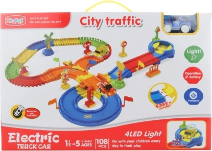 Тази писта с автомобилче е изработена от качествена пластмаса и е предназначена за деца още от 18-месечна възраст. След поставяне на 1 AA батерия (не е включена в комплекта) автомобилчето светва и започва да се движи по пистата. Комплектът съдържа общо 108 части, което позволява сглобяване на разнообразни форми и трасета, които децата да изследват. Благодарение на размера си пистата е лесна за пренасяне и може лесно да се съхранява или разглобява при необходимост.
