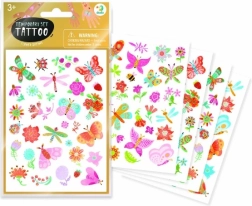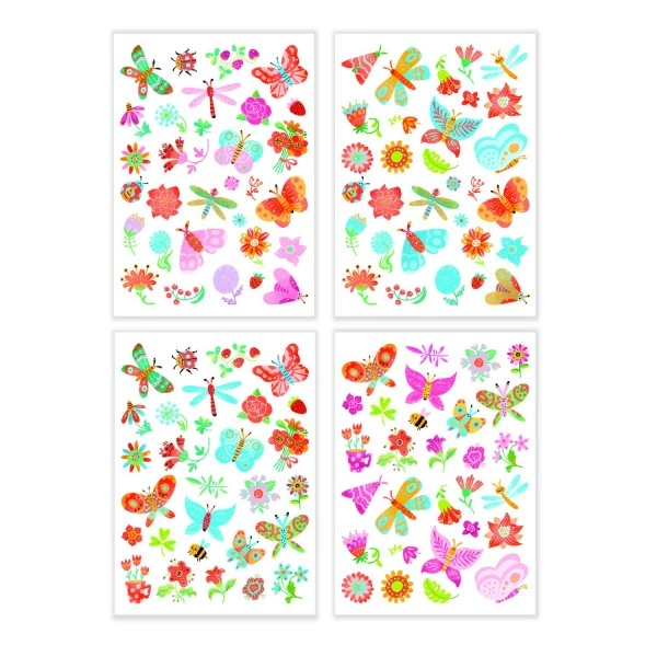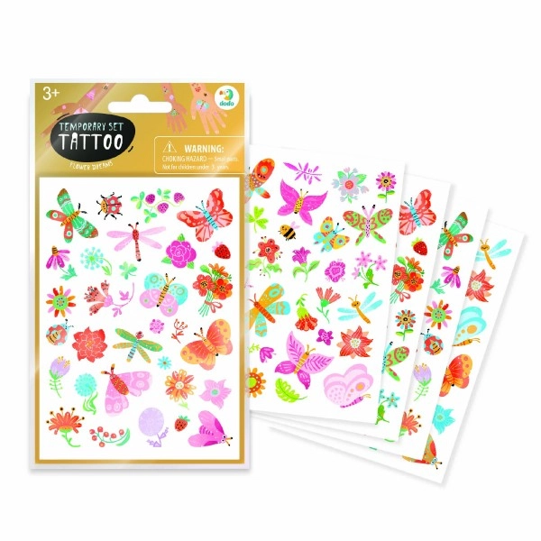 Украси кожата си с нежни природни мотиви. Този комплект временни татуировки предлага цветни пеперуди и цветя, лесно нанасяне за 30 секунди и безопасно премахване със сапун или бебешко олио. Опаковката съдържа 4 листа татуировки с пролетни мотиви, подходящи за деца от 3 години.
