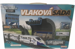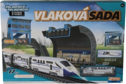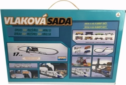 - 1× локомотив със светлинен ефект, 1× вагон, 14× релси, 1× станция