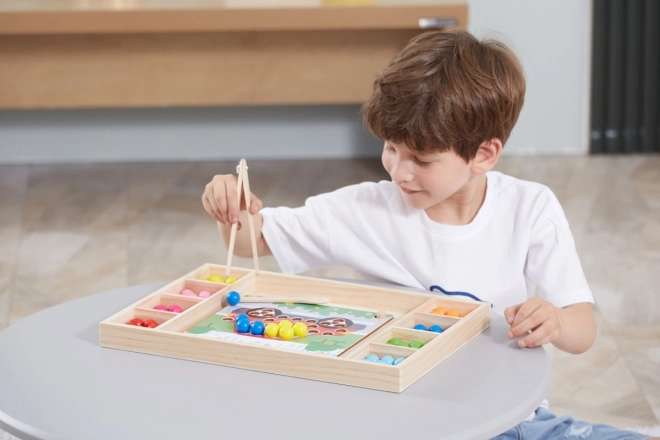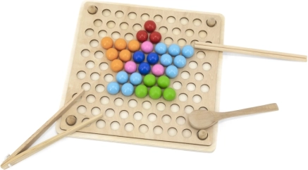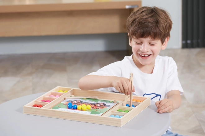 Дървената образователна игра „Хвани и Подреди“ позволява на децата да изпробват различни шарки и цветове според приложените листове или собственото им въображение. С тази игра децата могат да закрепят листа върху дървена поставка и с помощта на пръчици, лъжичка или щипка да поставят цветни топчета в отворите на дъската. Накрая децата могат да създадат красиви изображения.