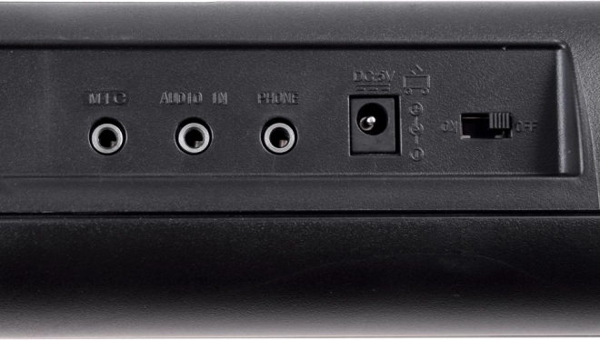 - MIC (вход за микрофон), AUDIO IN (line in), PHONE/LINE OUT (слушалки / изход към външни високоговорители)