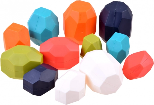 В комплекта има 12 камъка с различни размери, форми и цветове, изработени от висококачествена пластмаса. Най-големият камък е приблизително 7,5 cm x 5 cm x 5 cm, а най-малкият е приблизително 5 cm x 3,5 cm x 3,5 cm. Комплектът е идеален като подарък и за съхранение на строителните камъни.