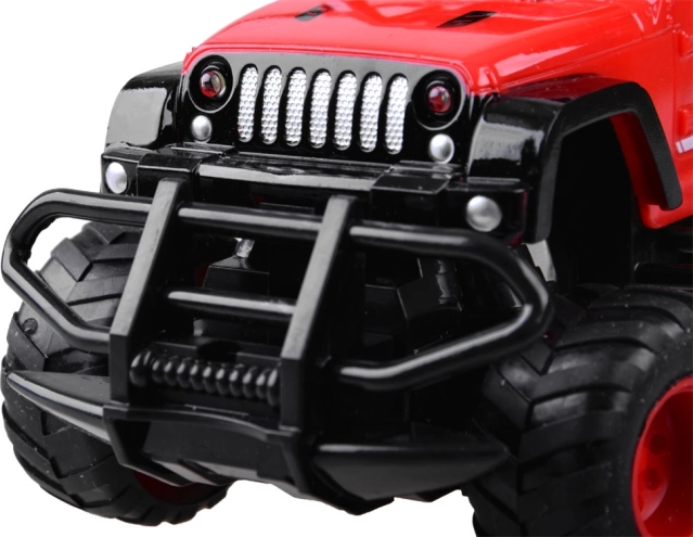 Автомобилът има големи текстурирани гуми и здрава предпазна решетка, които позволяват движение дори по неравни терени.