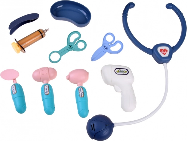Комплектът включва различни медицински принадлежности като стетоскоп, който благодарение на вече поставените батерии възпроизвежда сърдечен ритъм, както и термометър, който при натискане издава кратък звук и светва.