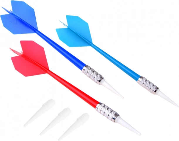 Комплектът включва три стрели с метални дръжки и бели пластмасови върхове, идеални за безопасни игри на закрито.