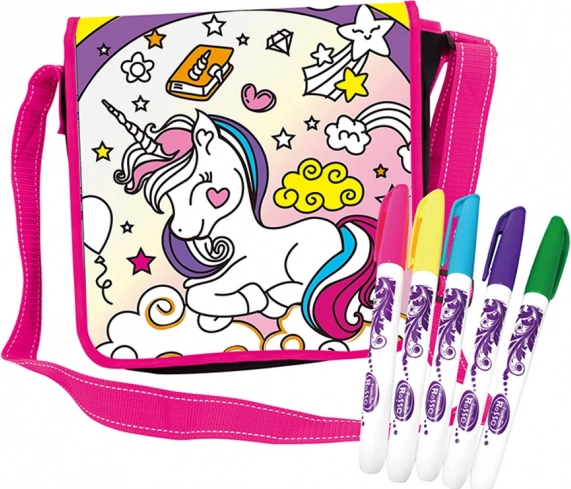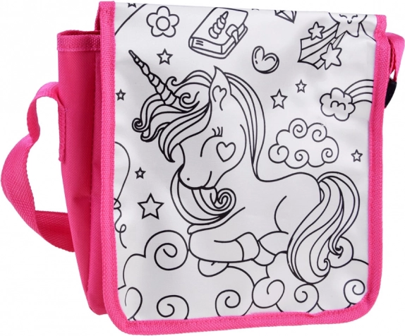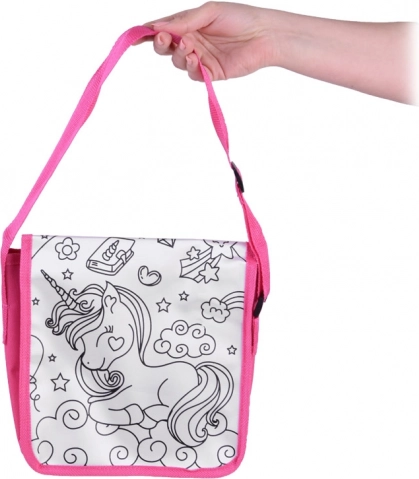 Креативна детска чантичка през рамо с мотив еднорог ще зарадва малките артисти от 6 години. Текстилната чанта децата могат да оцветят с включените флумастери (син, розов, лилав, зелен, жълт) и след изпиране да я оцветяват отново и отново. Практичният регулируем ремък, компактните размери 23 × 23 × 5 cm и сладкият дизайн правят чантата чудесен аксесоар за всеки ден.