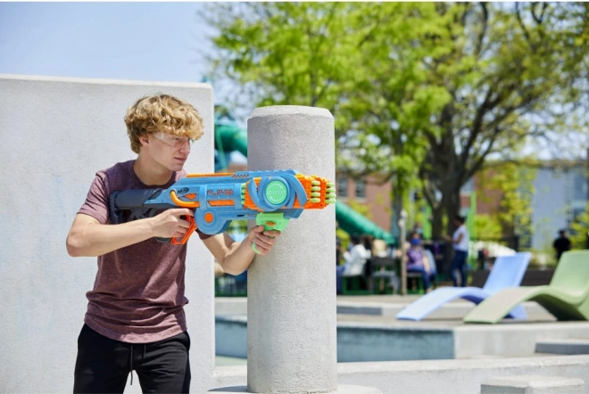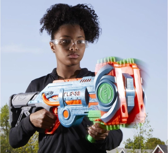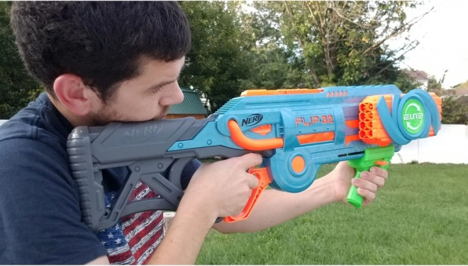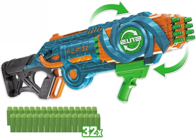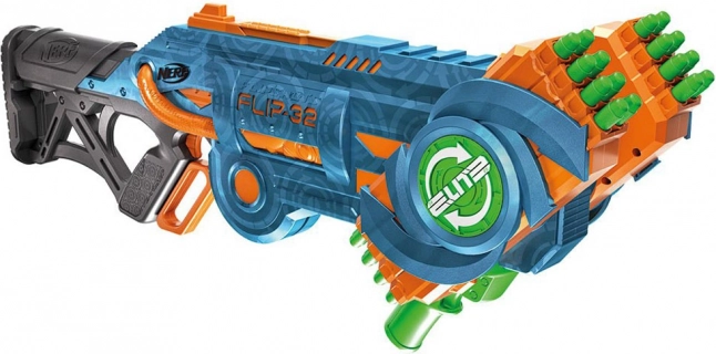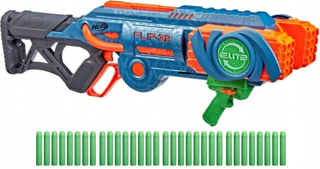 Бластърът Nerf Elite 2.0 Flip-32 е изработен от качествена пластмаса, а стрелите са от безопасна пяна с гумени върхове. Системата с въртящи се пълнители осигурява гъвкавост и продължаване на играта дори след изстрелване на първата серия стрели. Достатъчно е да завъртите пълнителя на 180 градуса и забавлението може да продължи. Двата режима на стрелба предлагат или единични изстрели, или двойна стрелба.