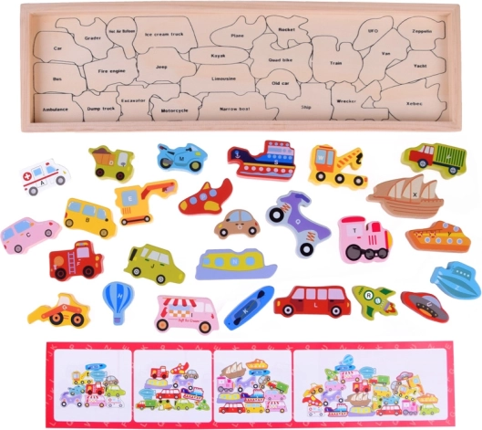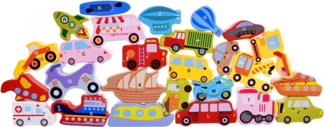 Този дървен комплект съдържа 27 цветни превозни средства – от кола, автобус и пожарна кола до балон, лодка, ракета и цепелин – и дървена подложка с обозначени названия. Всеки елемент носи буква A–Z (включително специален мотив), което помага на децата да учат азбуката по забавен начин и да разширяват речника си.