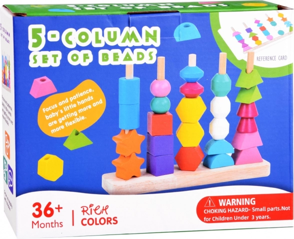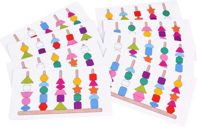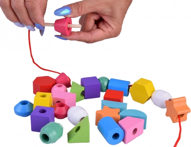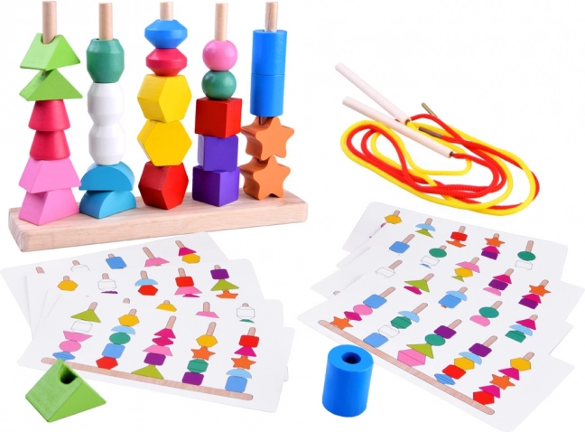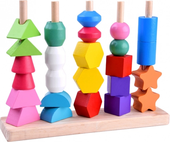 Пъстър дървен комплект с 25 форми развива фината моторика, координацията око–ръка и разпознаването на цветове и форми. Децата могат да нижат елементите на връзки или да ги подреждат върху колчета по карти с модели – забавно предизвикателство за концентрация, логика и търпение.