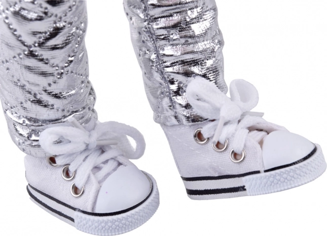 Мекото розово кожухче, наушниците и сребристите панталони са допълнени от бели обувки с връзки – идеално за зимни приключения във въображението.