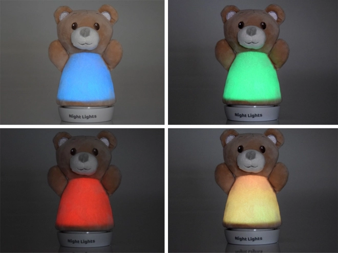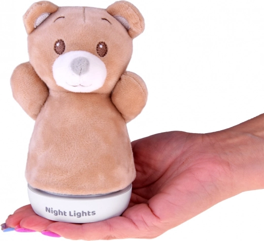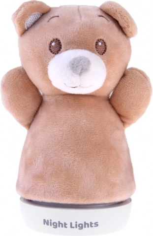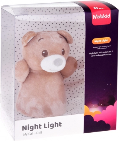 Опростената стабилна основа позволява сигурно поставяне на нощно шкафче или рафт. Светлината автоматично сменя цветовете (напр. синьо, зелено, червено, жълто) и създава приятна атмосфера за малки деца и бебета. Плюшеното покритие може лесно да се свали и почисти.