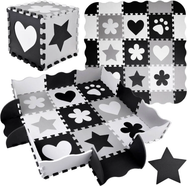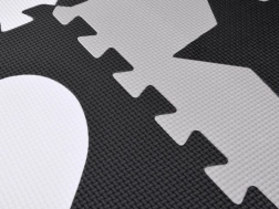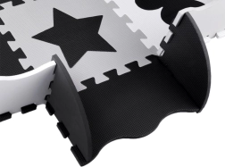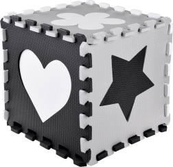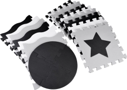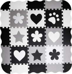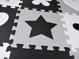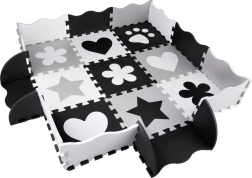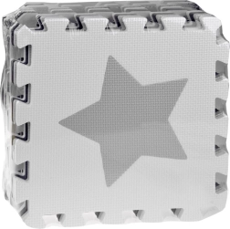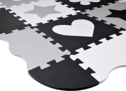 Стилна и безопасна детска подложка от пенови пъзели в нюанси на сиво, черно и бяло създава меко и хигиенично място за игра. Комплектът съдържа 16 големи части с изваждащи се форми, неплъзгащо покритие и топлоизолация. Благодарение на възможността за сглобяване и във височина може да се направи малък ограден/ограничен пространствен кът за играчки или топки.