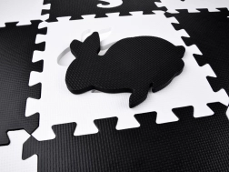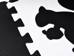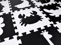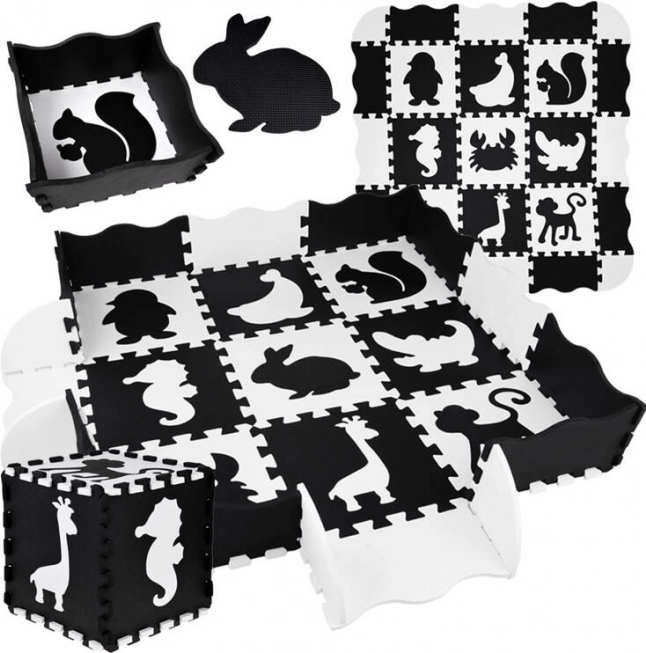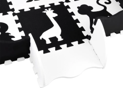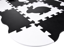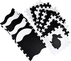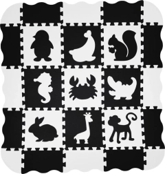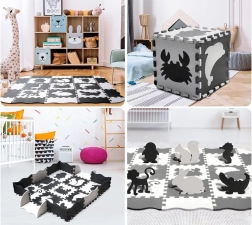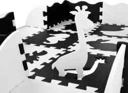 Стилна черно‑бяла пенена постелка от 16 части създава безопасно и удобно място за игра за бебета и по‑големи деца. Контрастните цветове стимулират зрението, меката EVA пяна абсорбира ударите, а двустранната повърхност с антислип текстура повишава безопасността. Елементите могат да се подреждат по желание, да се издигат ръбове във височина и така да се създава затворено пространство за играчки или топки.