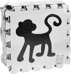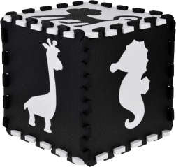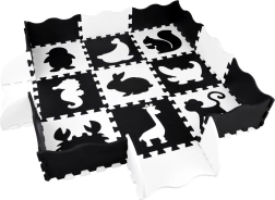 Тази контрастна пенена постелка с животински мотиви съчетава модерен външен вид и практичност. 16‑те меки части с размер 30 × 30 × 1 см лесно се подреждат до размер 120 × 120 см или се адаптират към пространството. Някои плочки имат подвижни централни елементи, които подпомагат фината моторика и ученето на форми и животни.
