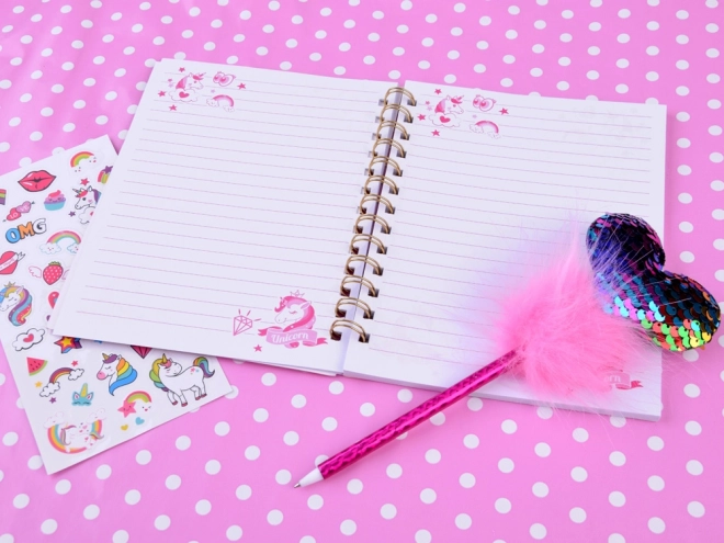 Този вълшебен дневник с мотив еднорог предлага идеално пространство за записване на вашите мисли, тайни и идеи. С лъскава корица, обсипана с блестящи частици, дневникът има уникална и привлекателна визия. Примамливият комплект включва също розова химикалка с пухкав помпон и блестящо сърце, заедно с цветни стикери за креативна украса.