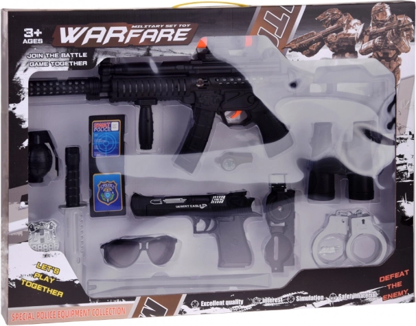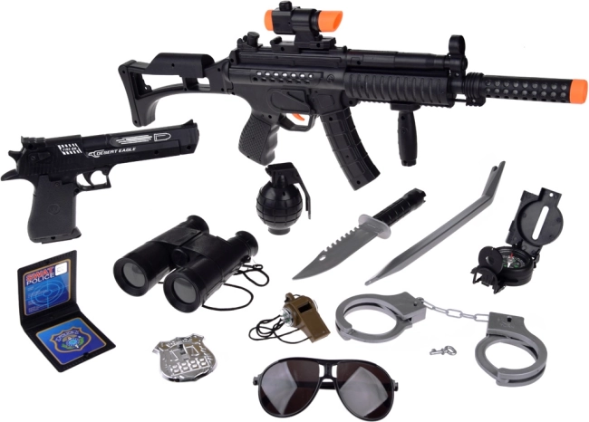 Комплектът осигурява пълно оборудване за реалистична игра на полицейски или военен служител.