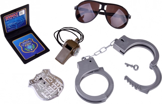 Този забавен полицейски комплект е страхотен подарък за всеки малък почитател на полицейската тематика. Съдържа общо дванадесет реалистични пластмасови аксесоара, които вярно наподобяват полицейско оборудване: