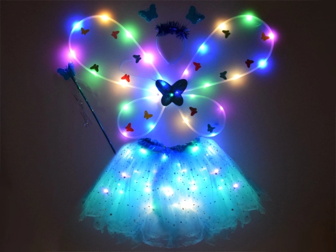 Този вълшебен фееричен костюм в син цвят ще зарадва всяко малко момиче. Костюмът включва пола с LED светлини, крила, диадема и вълшебна пръчка, като осигурява магическо изживяване за всеки повод.
