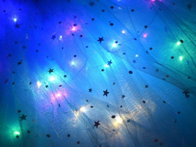 Синя тюлена пола, украсена със звездички и LED светлини за магичен вид. Еластичният колан осигурява удобно носене.