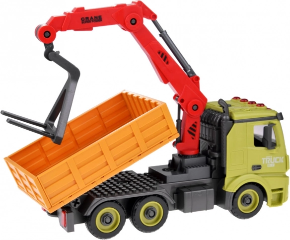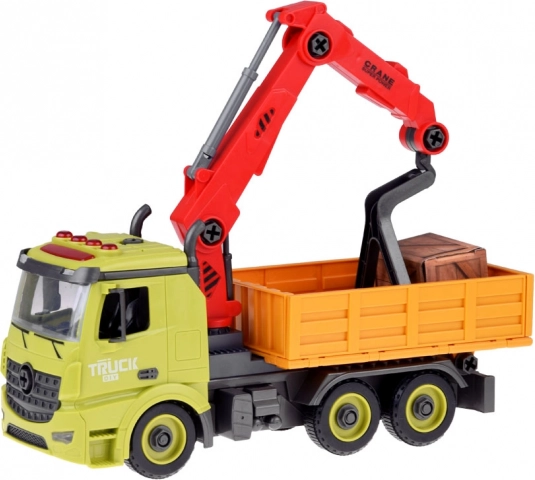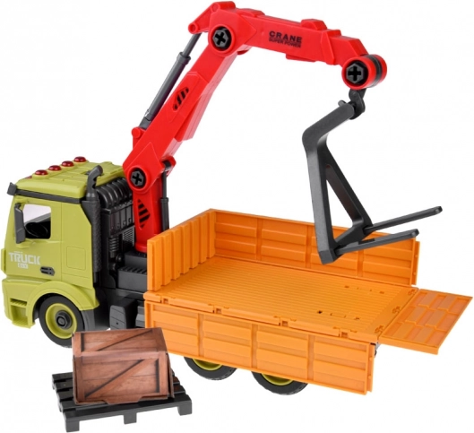 Този пластмасов камион с кран в живи цветове е готов за часове забавление. Въртящото се и изтеглящо се рамо повдига щайга, отваряемата странична стена улеснява товаренето, а фрикционното задвижване се грижи за плавен старт без батерии. За интерактивна игра са налични звукови ефекти – стартиране на двигателя, клаксон, тон при заден ход и маяк.