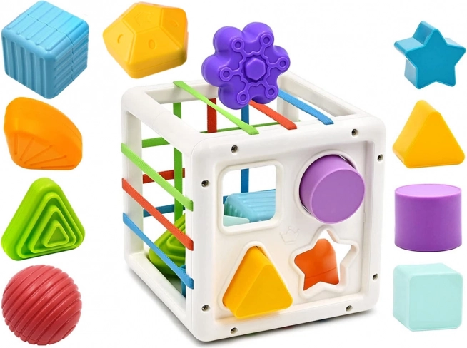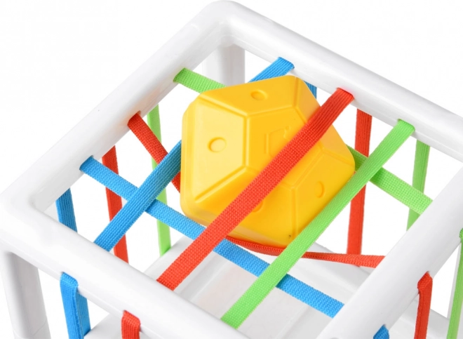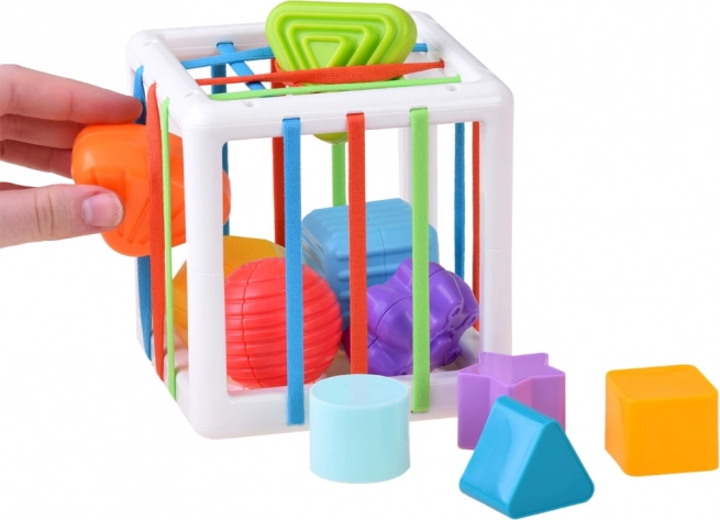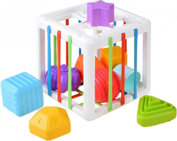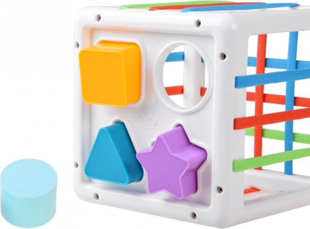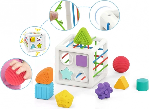 Тази образователна игра за сортиране предлага на децата много смислено забавление – поставяне и изваждане на елементи през цветните еластични ленти и през профилираните отвори. Благодарение на пъстрата палитра от форми (триъгълник, квадрат, кръг, звезда, сфера, цвете, петоъгълник и др.) децата упражняват разпознаване на форми и цветове и естествено развиват фината моторика.