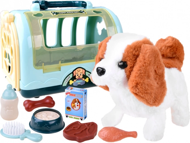 Очарователният комплект с интерактивно кученце порода бигъл носи на децата часове забавление и грижа. Включва мек плюшен приятел, практична преносима клетка и богати аксесоари за хранене и сресване. Кученцето умее да върви напред, да лае, да махa с опашка и при галене по главата издава звуци на кученце. Идеален подарък за малки любители на животни.