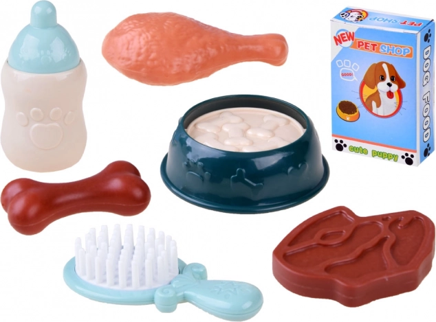 Комплектът включва купичка с имитация на храна, бутилка, четка, кост, пилешко бутче, стек, кутийка с храна и стикери – всичко необходимо за реалистична грижа.