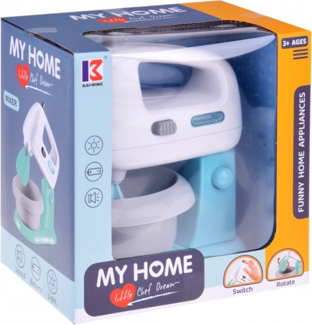 Играчката наподобява истински кухненски миксер с въртящи се бъркалки и син светещ ефект.